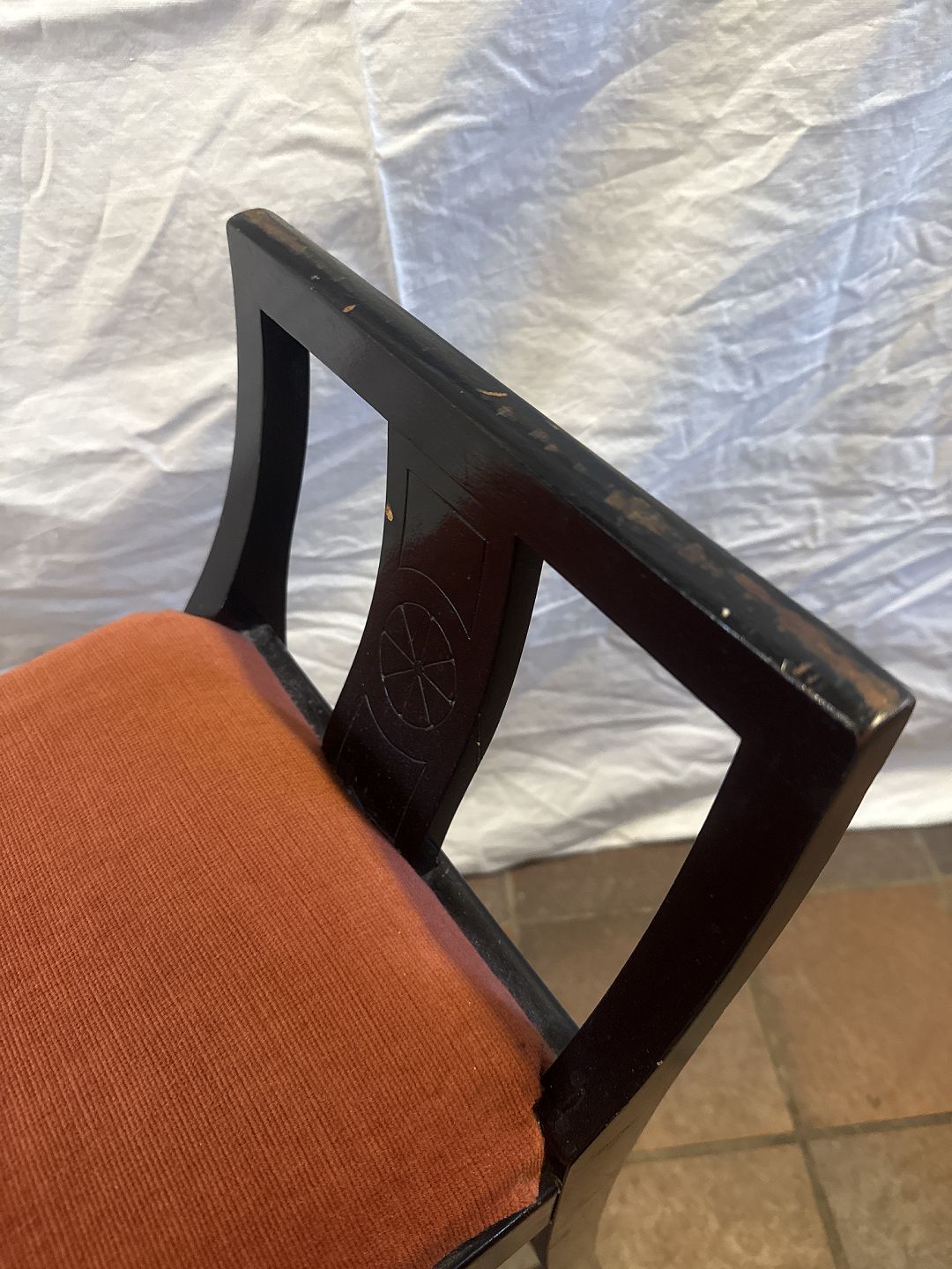 Klaverbænk i sortlakeret træ betrukket m. rødt velour stof.