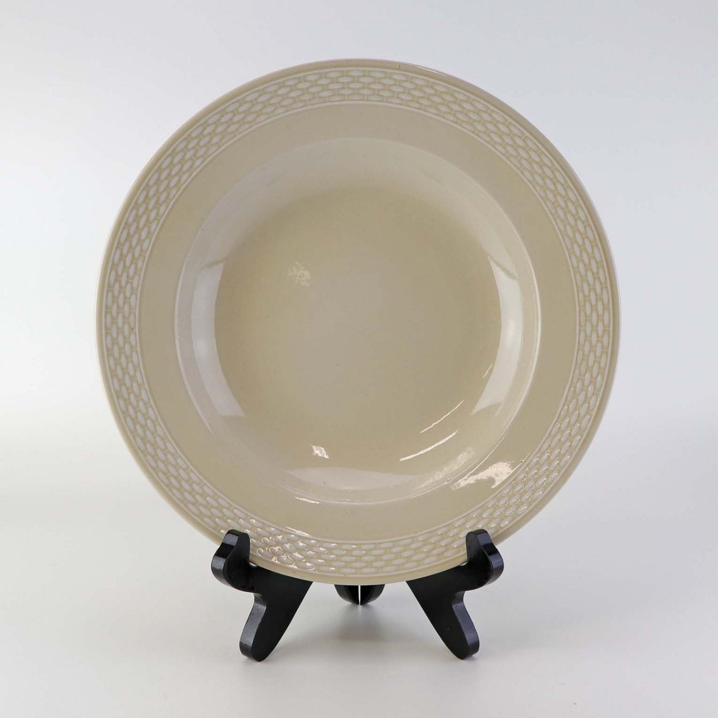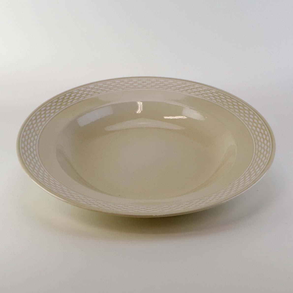 Sandfarvet fajancestel i stelform Viktoria II - Fletværk med dekoration af hvidt flet på gullig baggrund.