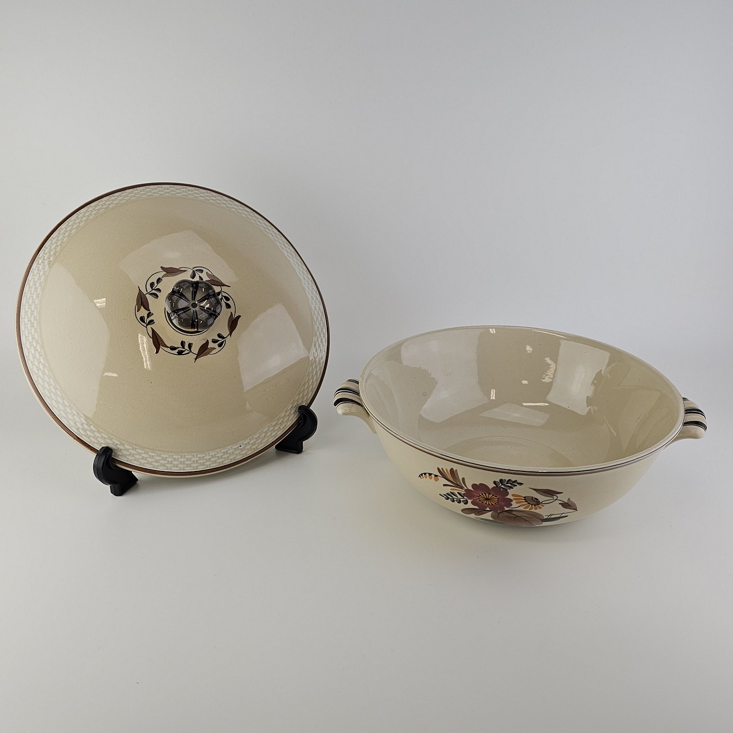 Knud er cremefarvet fajance dekoreret med flettet kant og brune og orange blomster. Stellet blev produceret i år 1934-1963.
