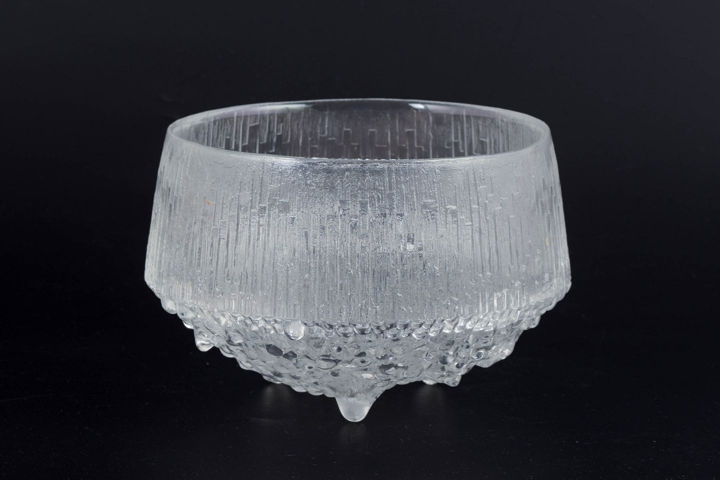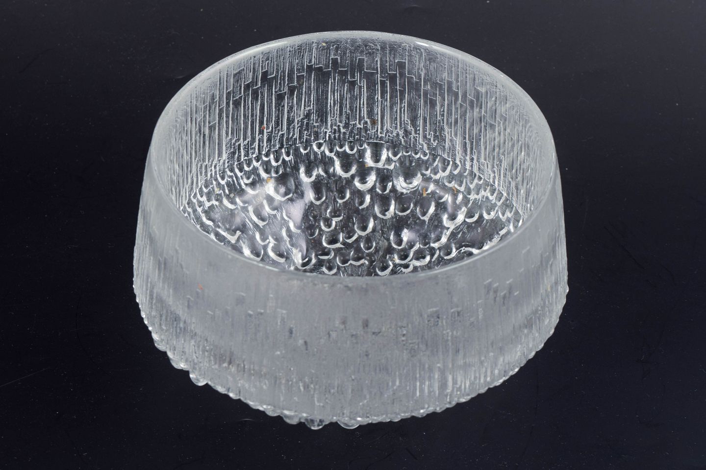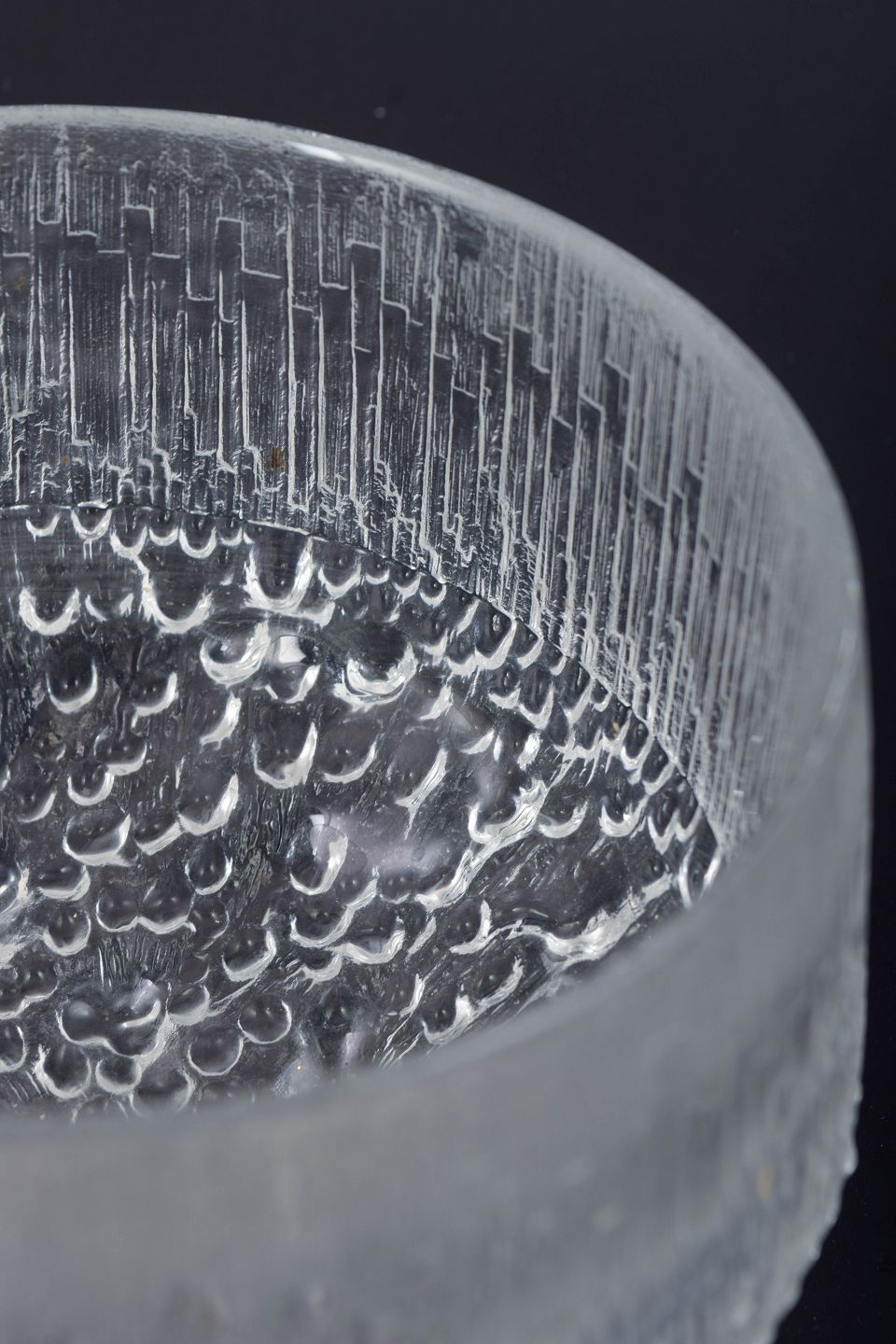 Skål i presset klart glas fra serien Ultima Thule med karakteristisk struktureret overflade inspireret af smeltende is og arktiske landskaber. Uden mærkning.