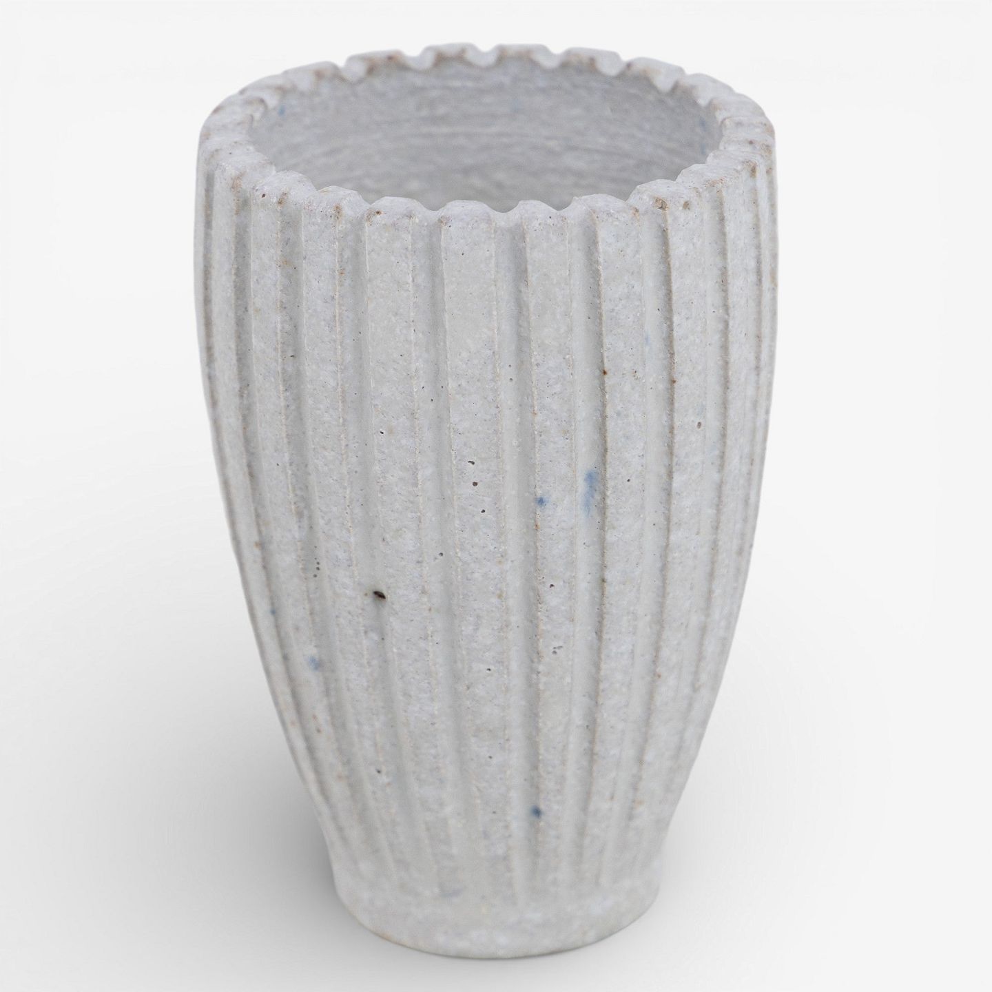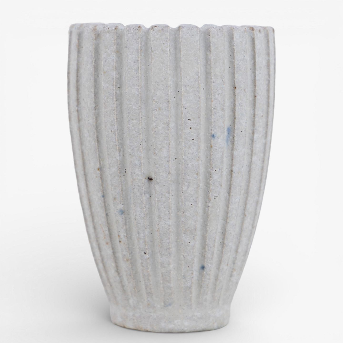 Lille, riflet vase i stentøj med hvid glasur. Signeret.
