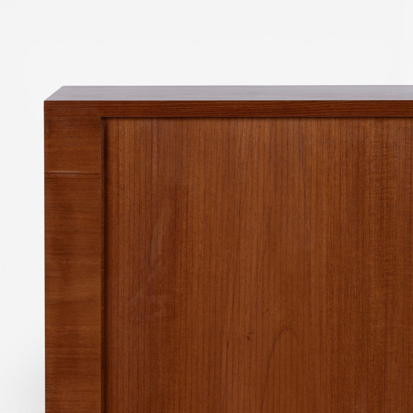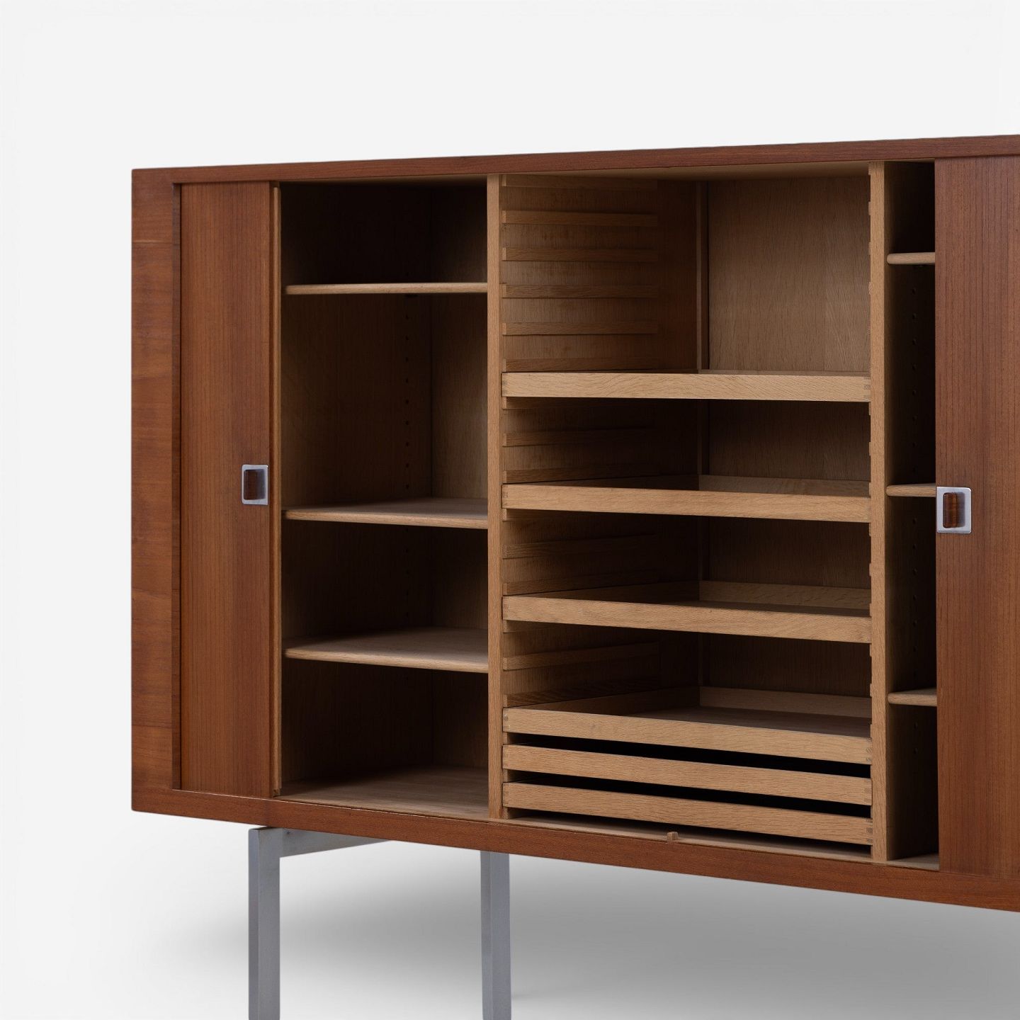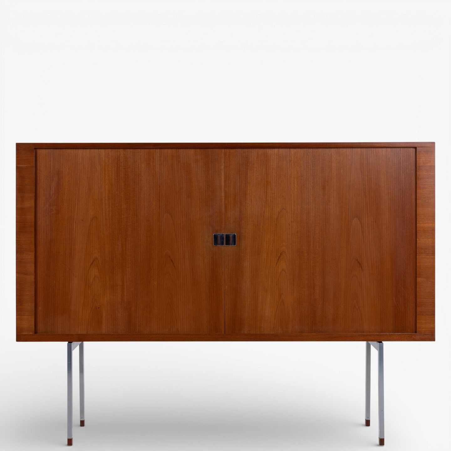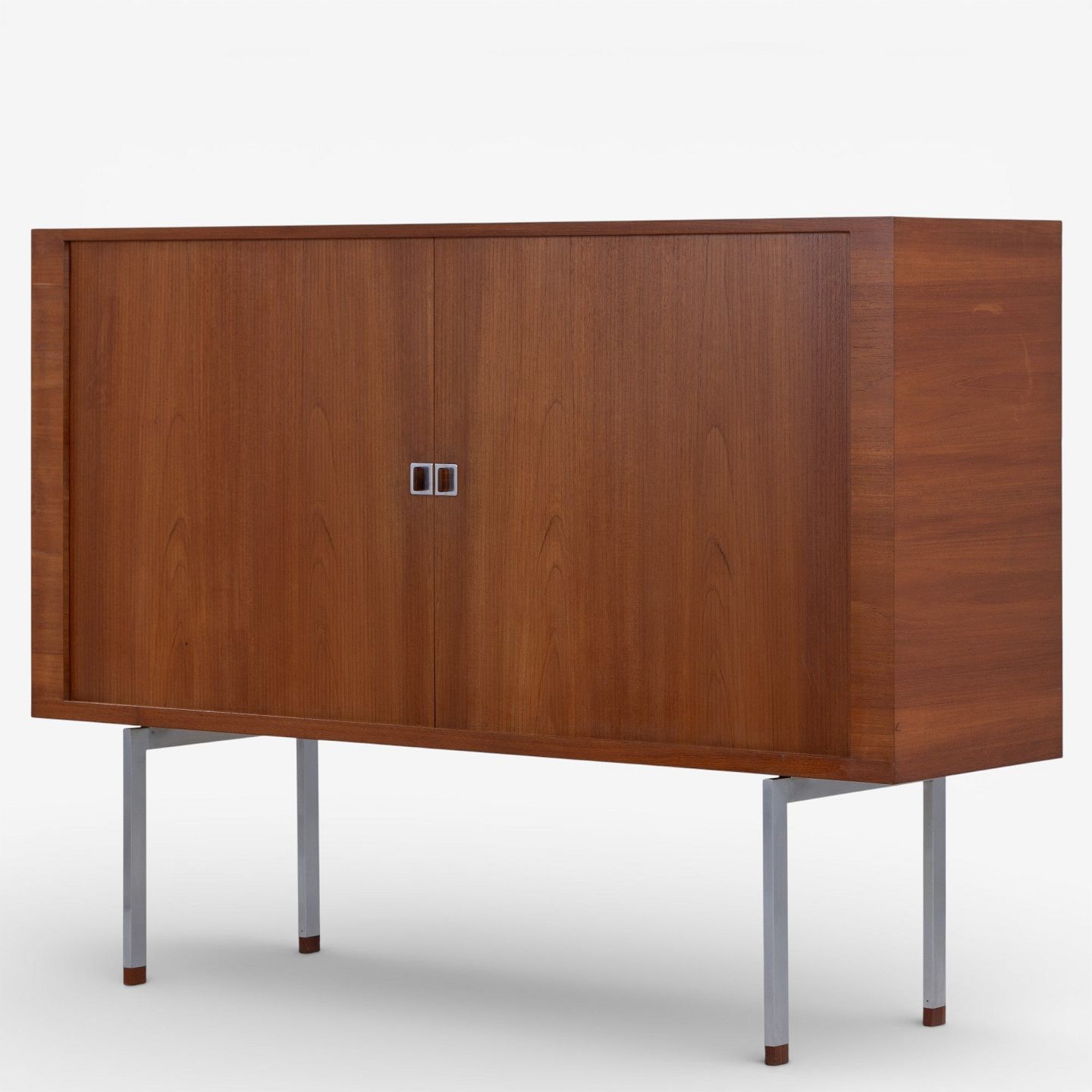 RY 25 - Høj skænk i patineret teak med jalousilåger på stel i stål med sko i teak.