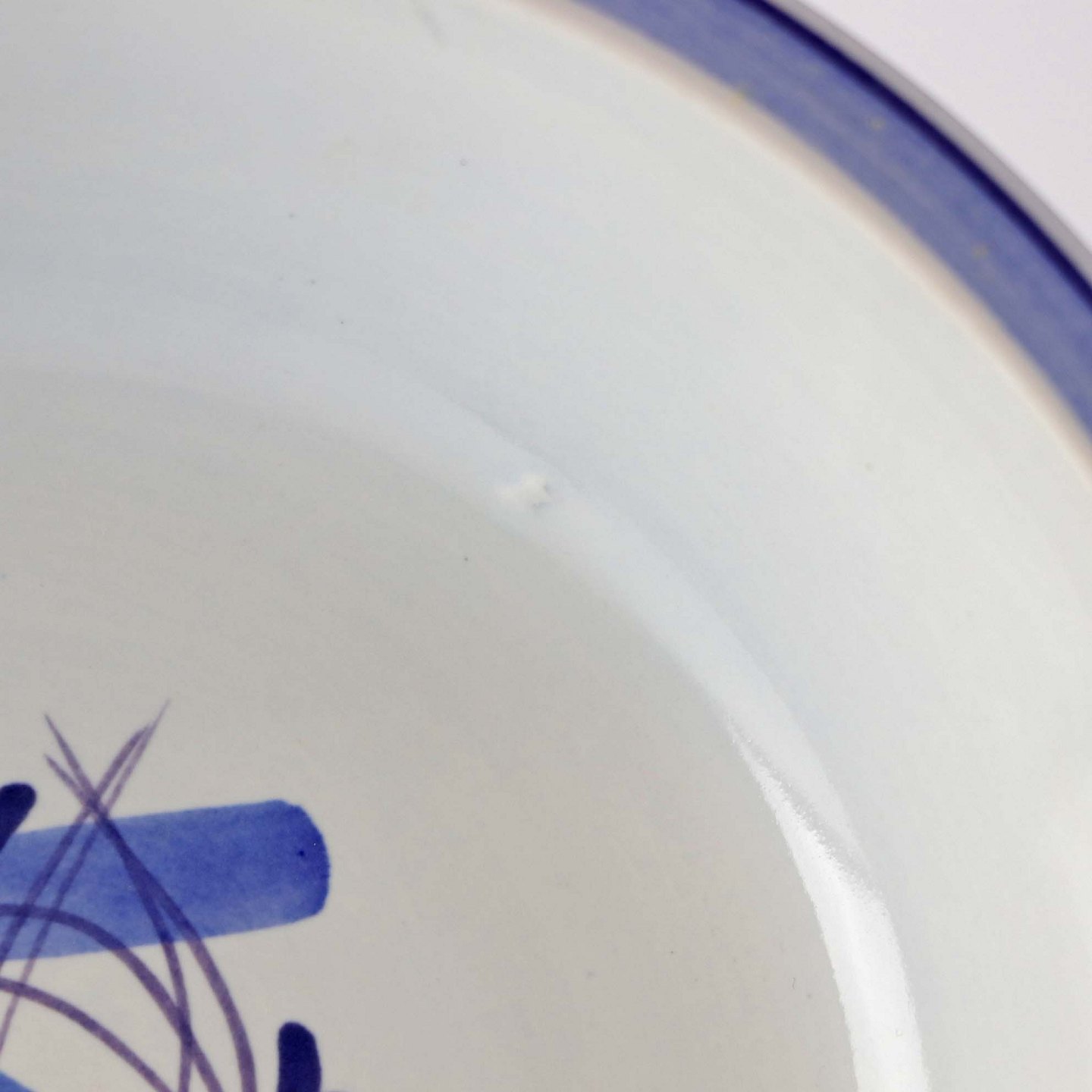 Fajancestel i stelform CA med dekoration af abstrakt motiv i blå og lyseblå på en råhvid baggrund.