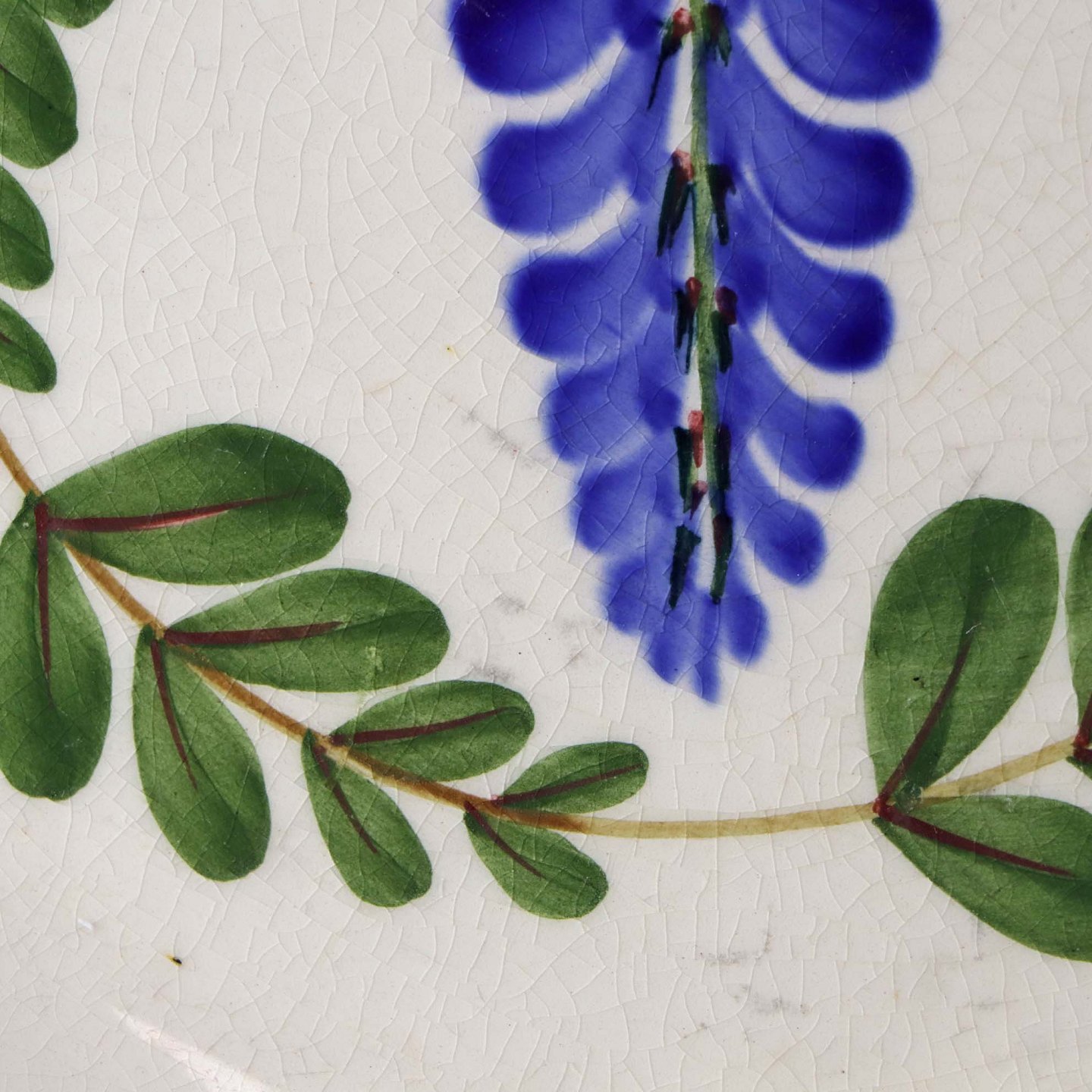 Fajancestel med dekoration af ranker af blåregn og blade på lys baggrund afsluttet med kant af runde blå pletter.