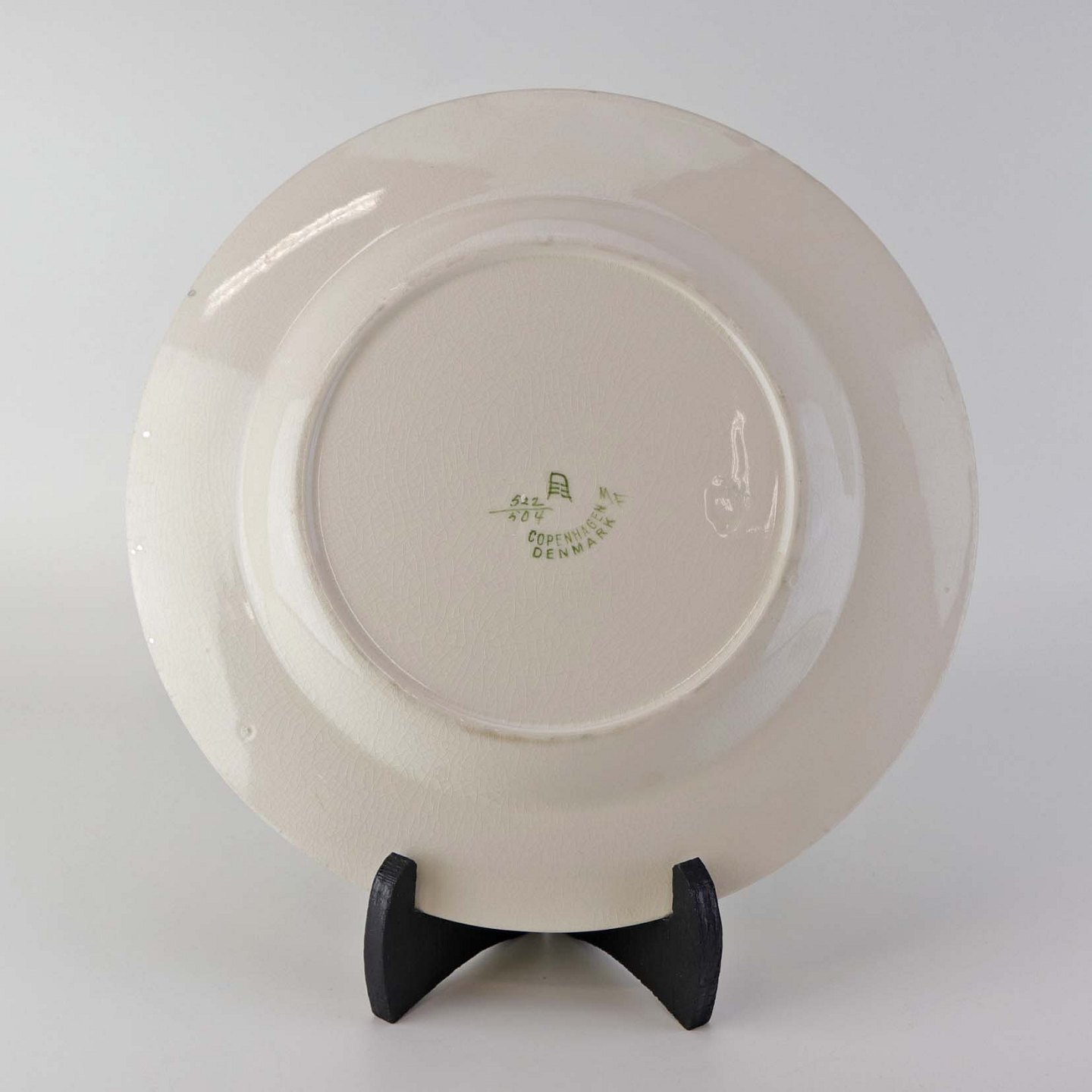 Flad middagstallerken i fajance fra stellet Blåregn. Stellet er fremstillet i perioden år 1903-1933. Nr. 522/504