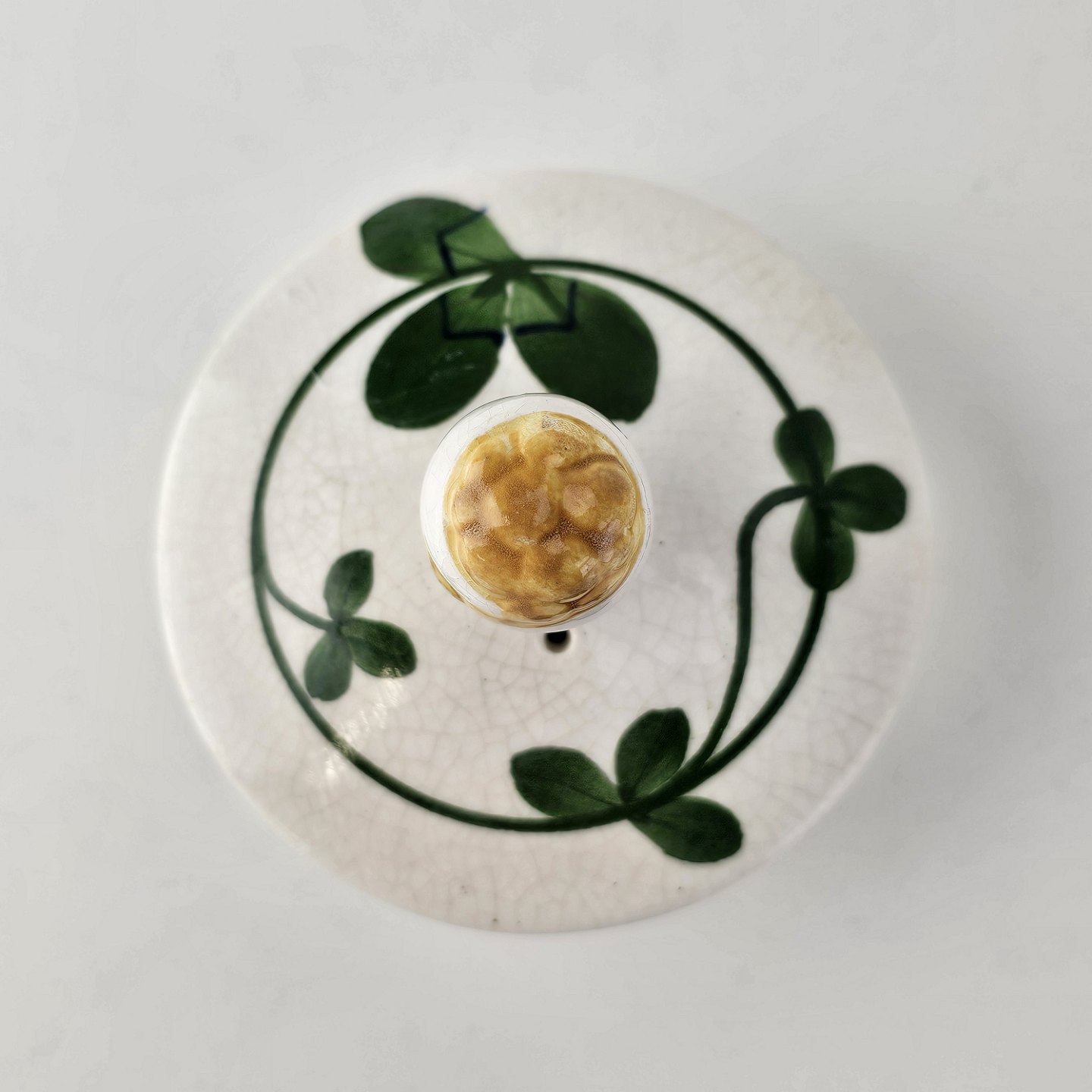 Kløver er fajancestel med motiv af rødkløver på lys baggrund.