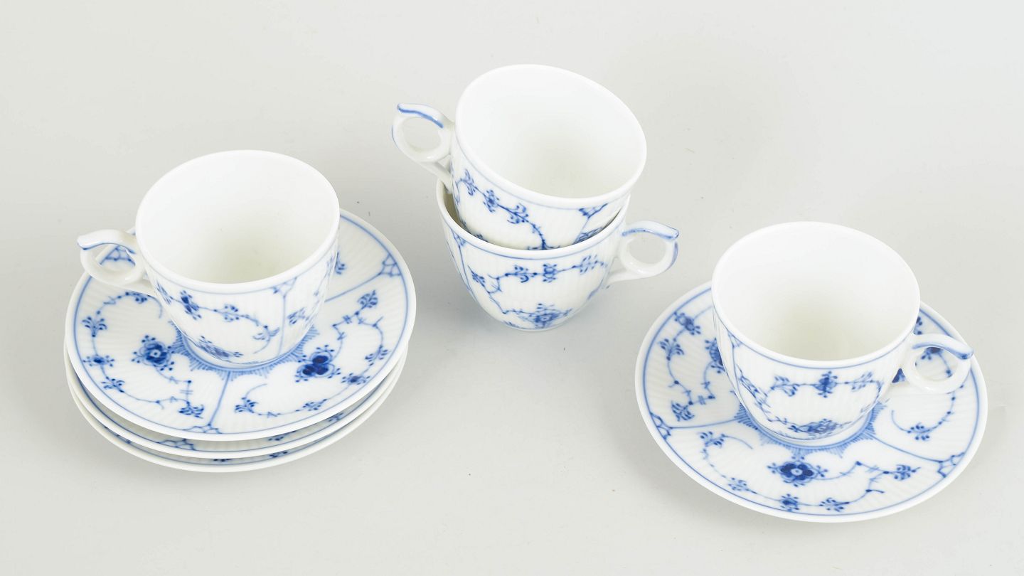 Royal Copenhagen Musselmalet Riflet, sæt af fire mokkakopper med underkopper.