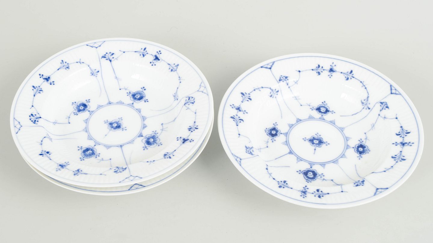 Sæt af tre dybe tallerkener i håndmalet porcelæn fra Musselmalet Riflet med klassisk underglasurdekoration i koboltblå. Model 1/170. Første sortering.