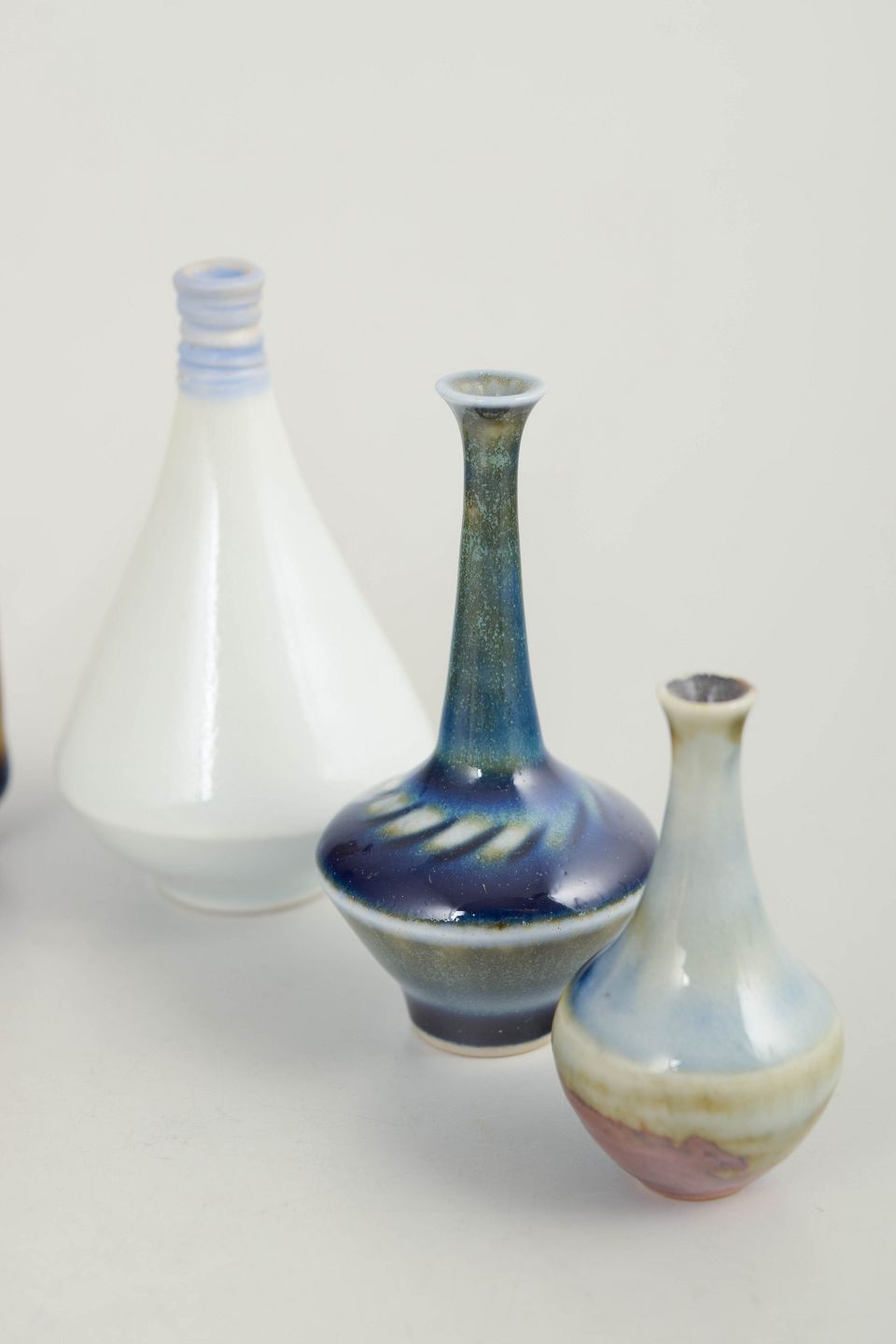 Collection of six miniature ceramic vases in varied forms and glazes. Made in ceramic with multicoloured glazes in blue, brown and light tones. All examples are marked on the base. Examples are from Höganäs and others from various makers.