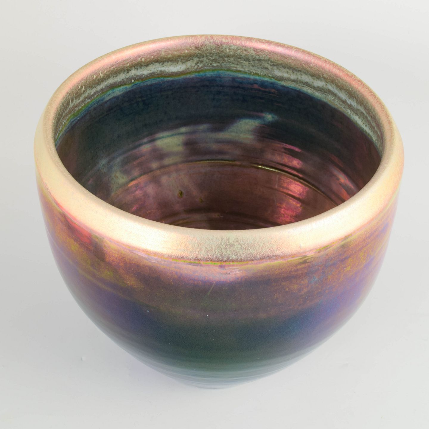 Meget stor drejet gulvvase eller plantekrukke i kraftigt stentøj med blank flerfarvet luster-glasur i violette, blå, grønne og rosa nuancer. Fremstillet hos Mobach i 1970’erne.