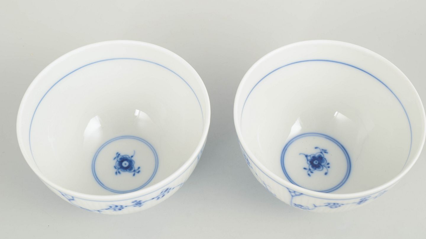 Text zugänglich auf Dänische: Royal Copenhagen Musselmalet Riflet sæt af to skåle.