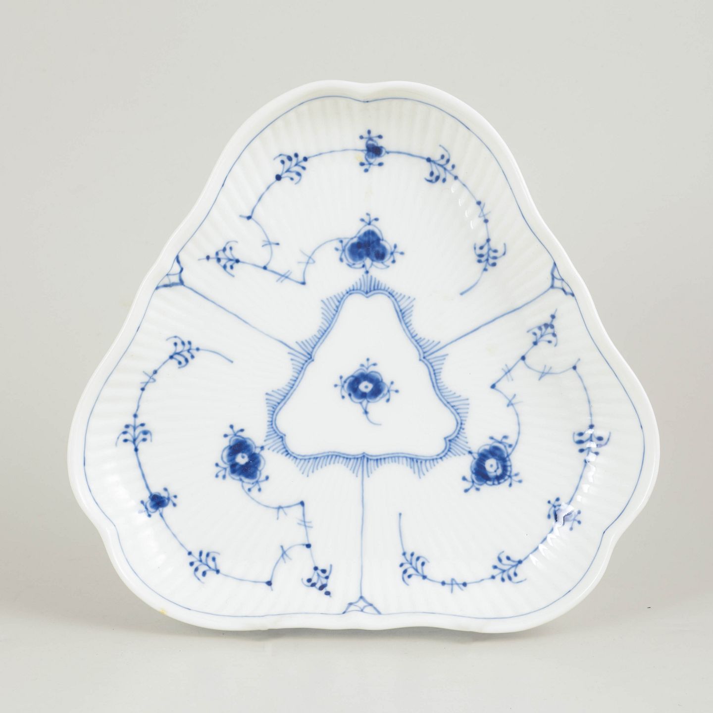 Trekantet fad i håndmalet porcelæn fra Musselmalet Riflet med klassisk underglasurdekoration i koboltblå og riflede felter.