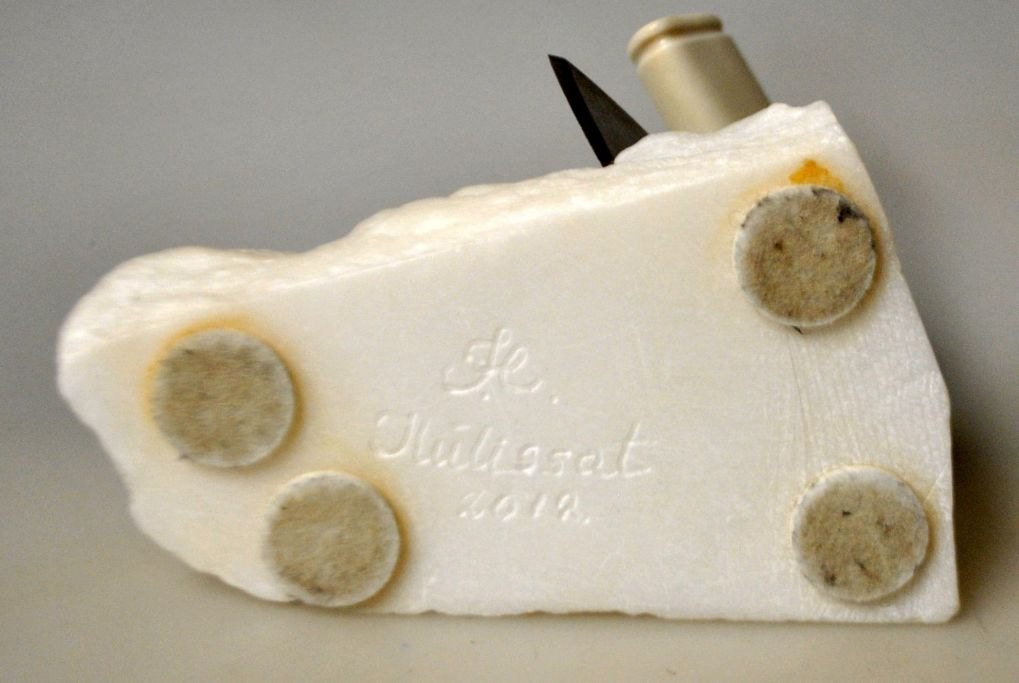 Grønlandsk figur, 2012. Figur og ulu i rensdyr knogle. På hvid fedtsten base. Signeret: Ilulissat. L.: 14 cm. B.: 8 cm. H. 10 cm.