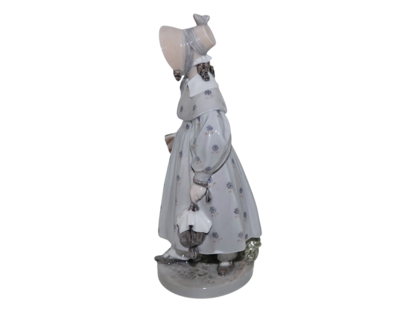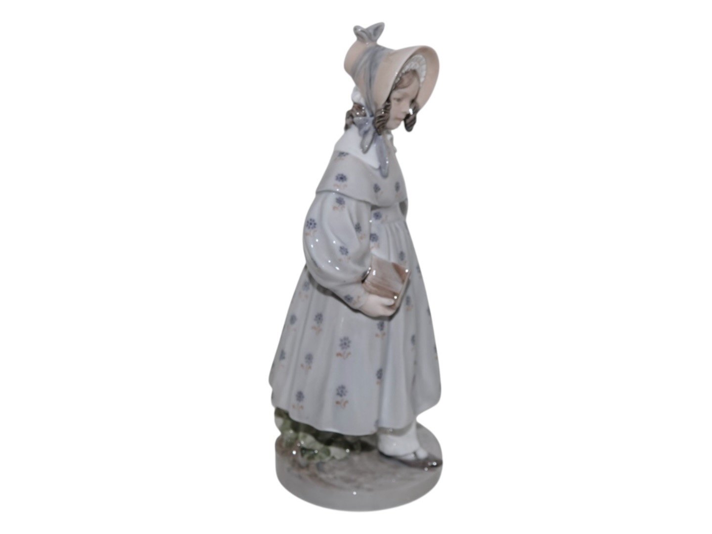Royal Copenhagen Art Nouveau, sjælden figur af pige i fin frakke med parably og bog.