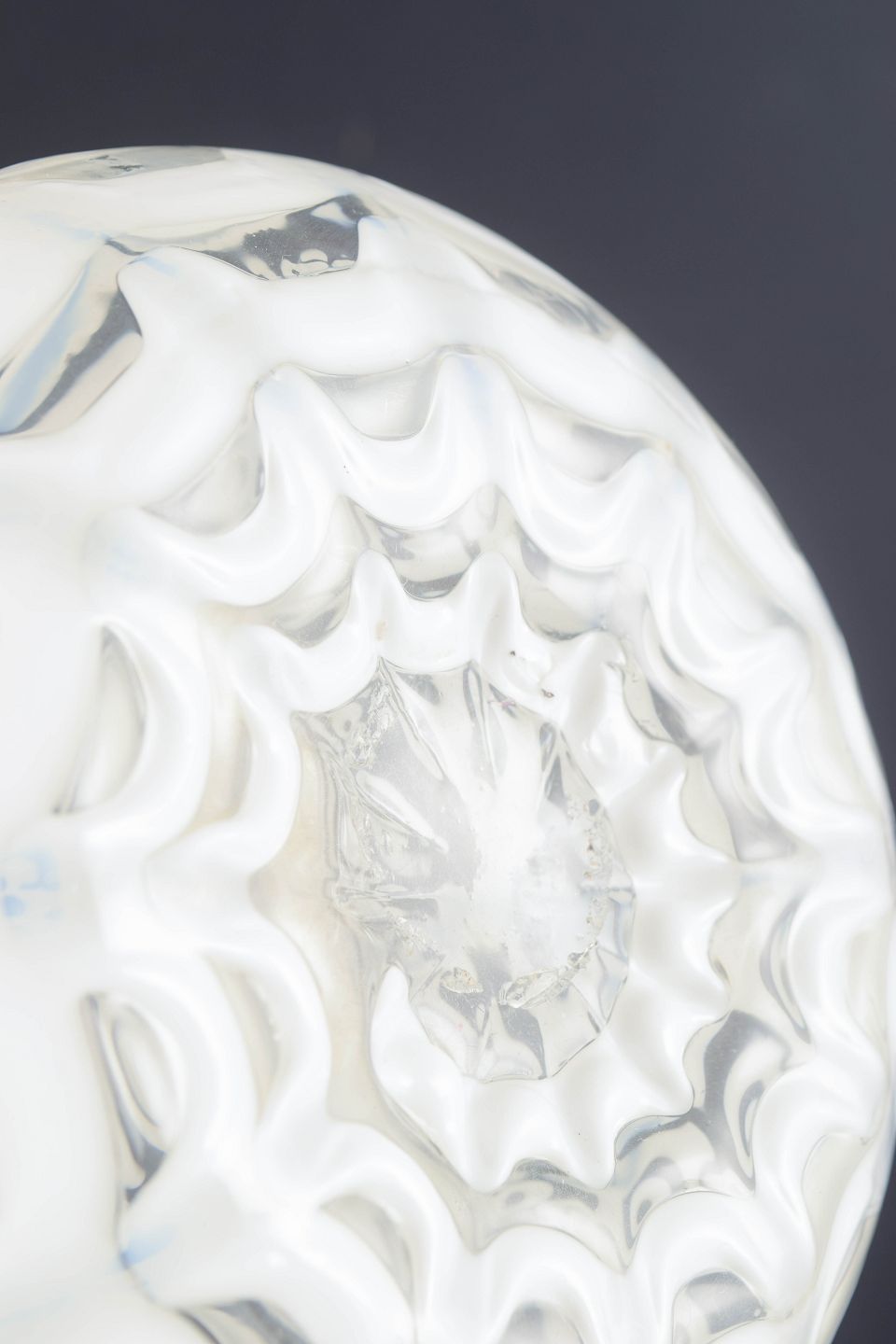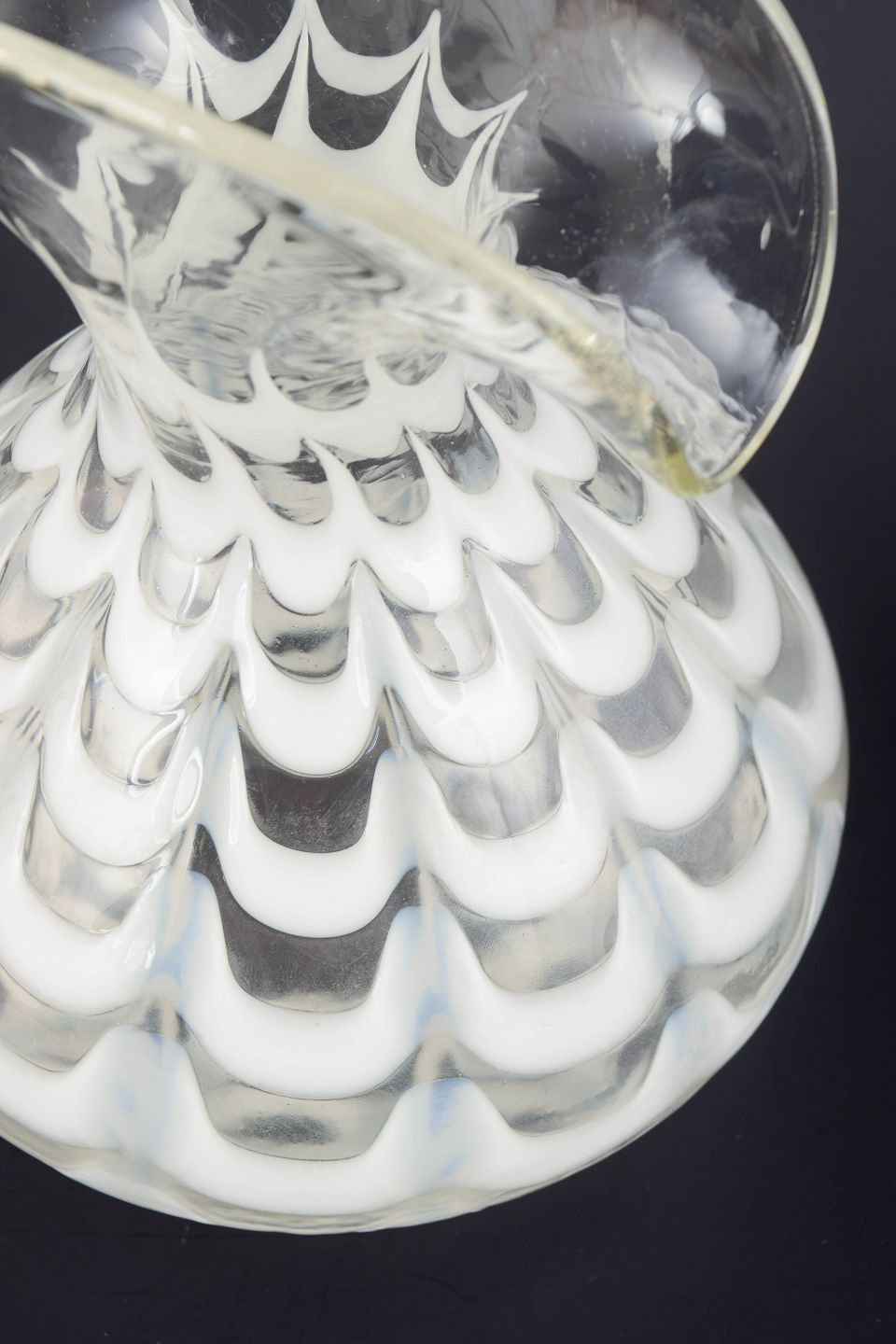 Organisk formet kunstglasvase i klart glas med hvid indlagt dekoration i bølgende, skællignende mønster og kraftigt udadbøjet rand.
