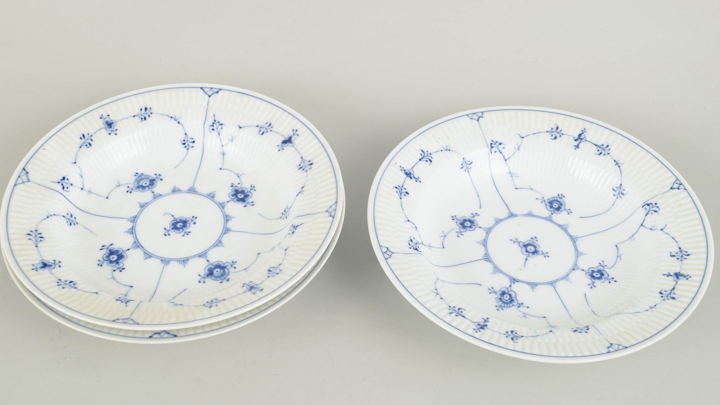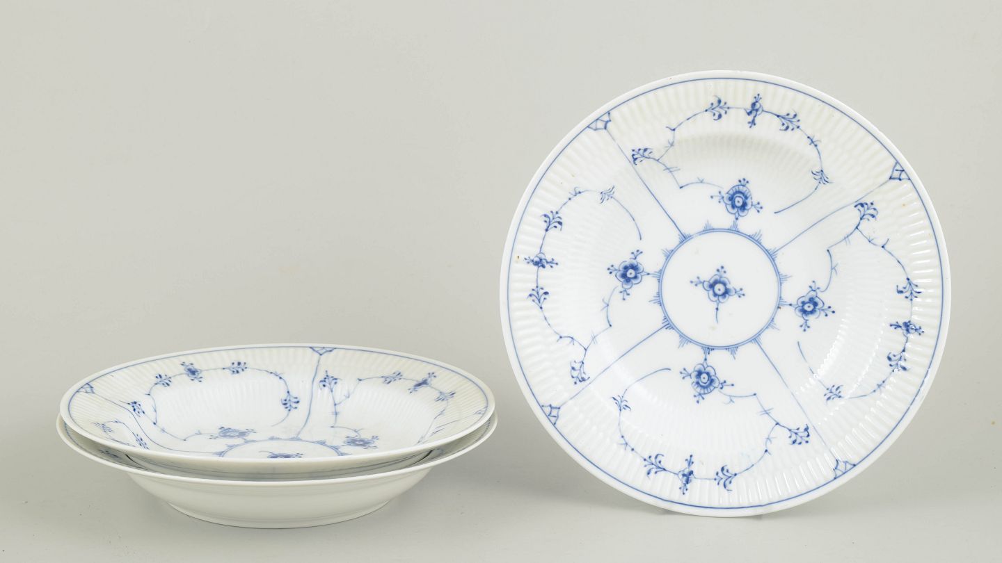 Tre håndmalede suppetallerkener i Musselmalet Riflet dekoration, model 1/165, fra 1920’erne. Første sortering.