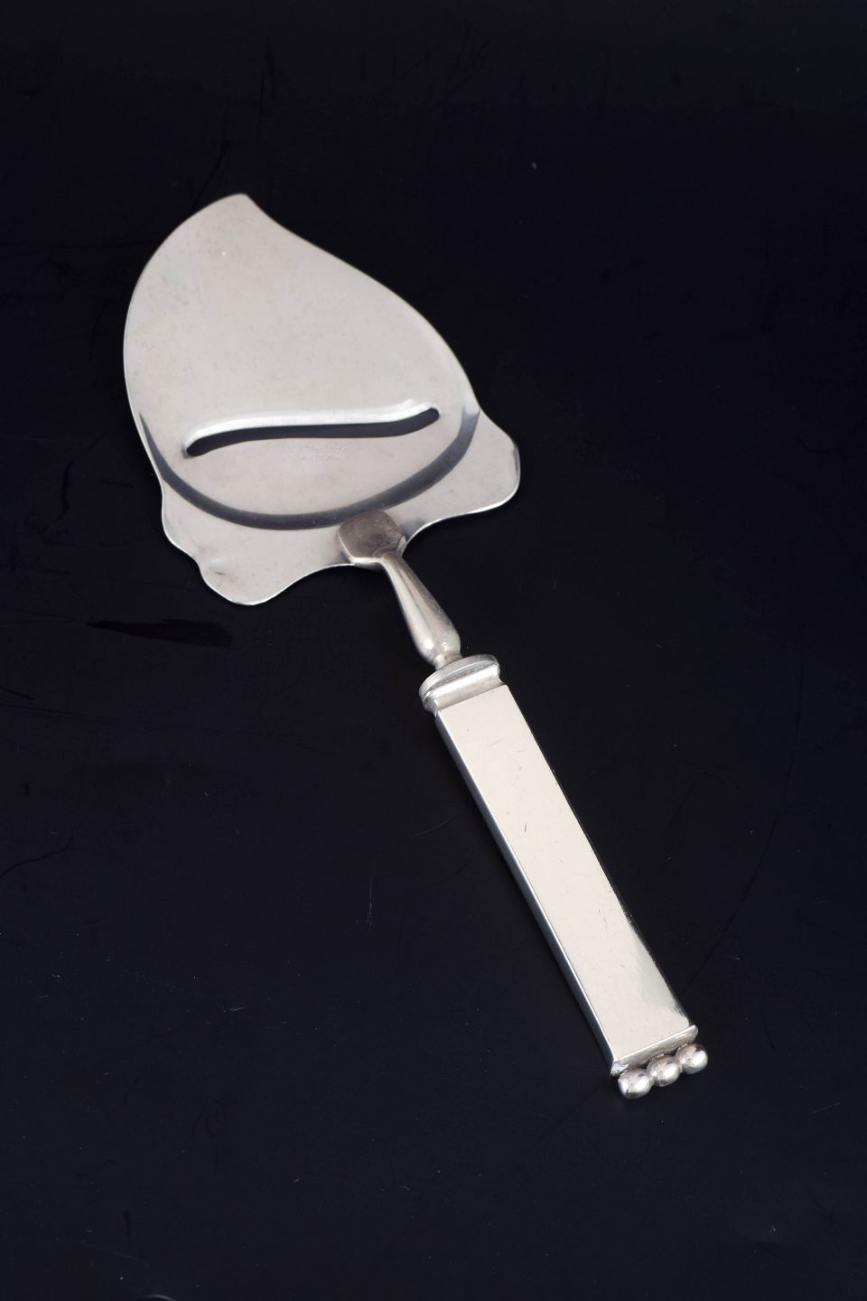 Art deco ostehøvl i tretårnet sølv og rustfrit stål. Model nummer 27 med dekorativt skaft i relief med stiliseret blomstermotiv. Fremstillet hos Evald Nielsen.