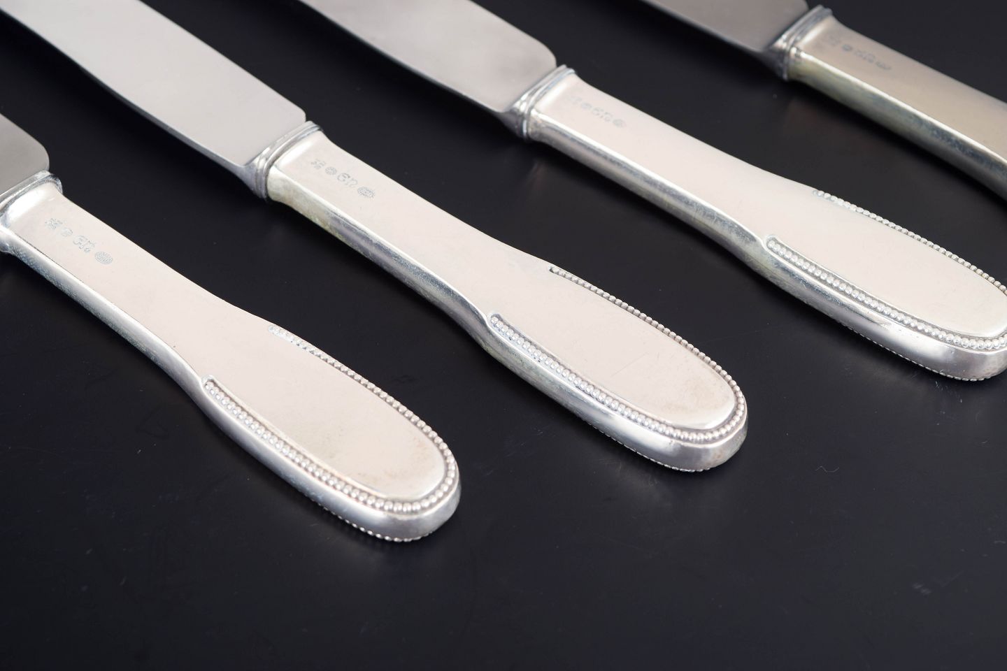 Elegante middagsknive i sølv 830 og rustfrit stål. Model nummer 14 med klassisk, let afrundet skaftform med diskret perlekant og glat klinge med skær. Fremstillet hos Evald Nielsen.