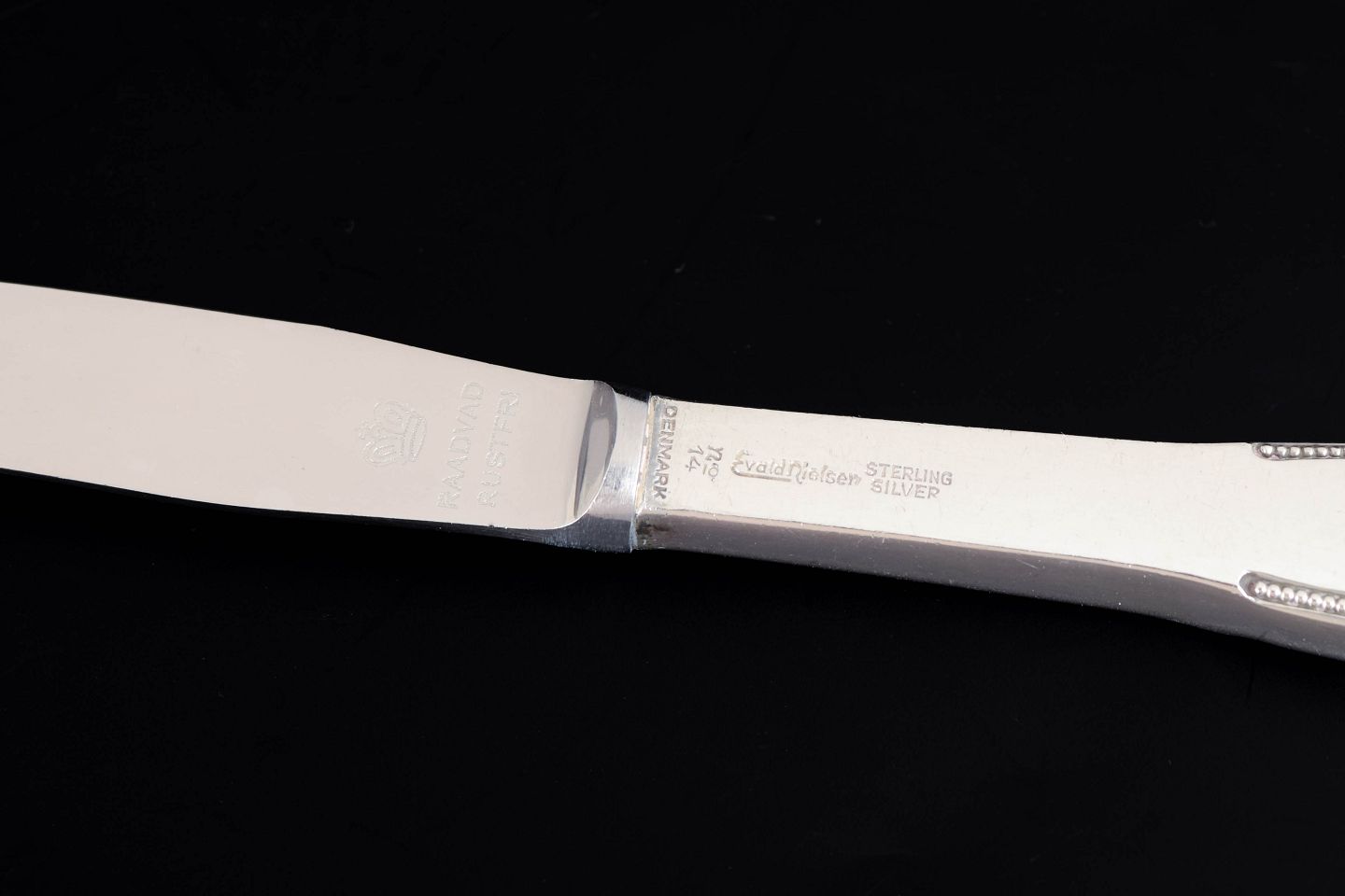 Elegante frokostknive i sterling sølv og rustfrit stål. Model nummer 14 med klassisk, let afrundet skaftform og glat klinge. Fremstillet hos Evald Nielsen.