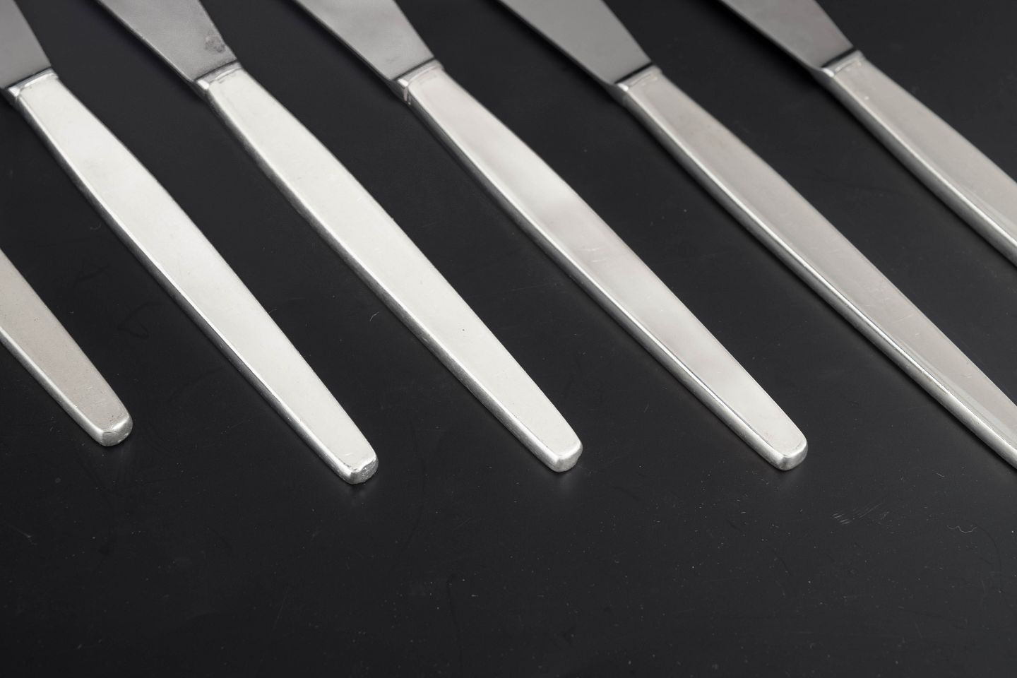 Sæt af seks frokostknive i rustfrit stål og sterlingsølv i modellen Cypress fra Georg Jensen. Bestikket er udført i et slankt og elegant formsprog med let konisk form og glatte, moderne linjer, karakteristisk for Georg Jensens efterkrigsdesign.