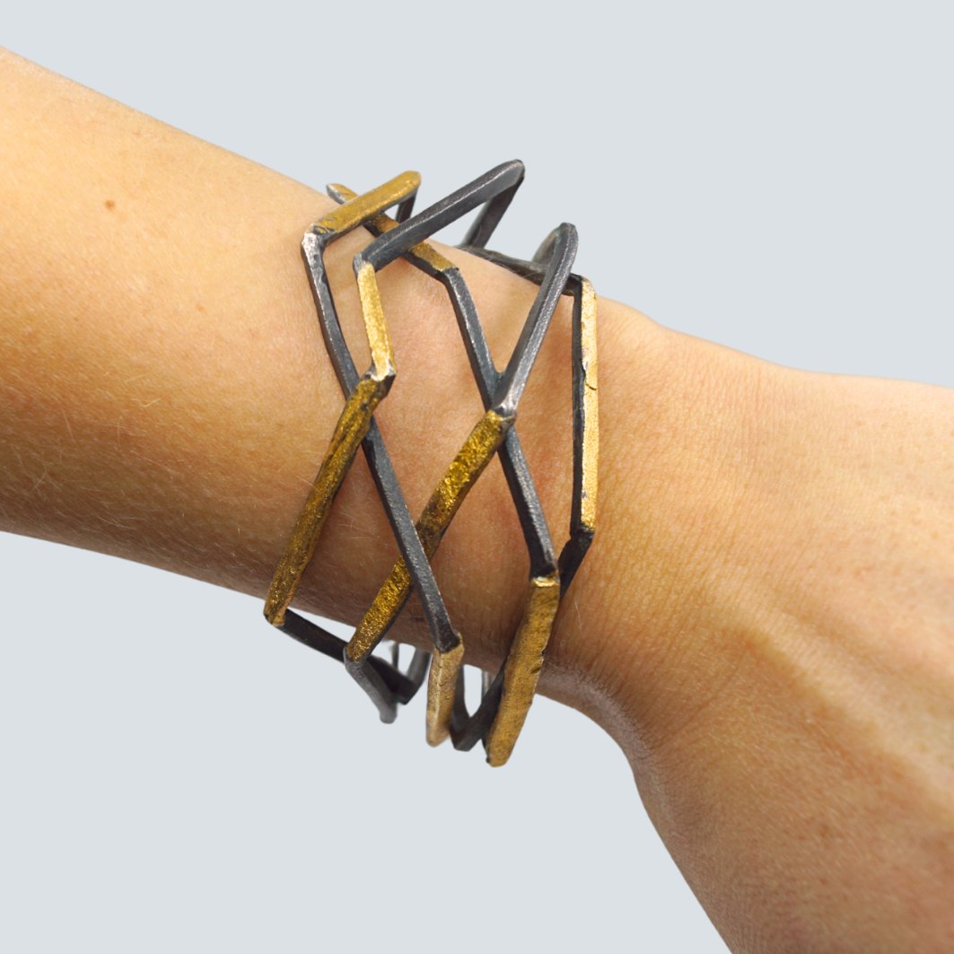 Anette Kræn; Bred armring i oxideret sølv, delvist forgyldt.