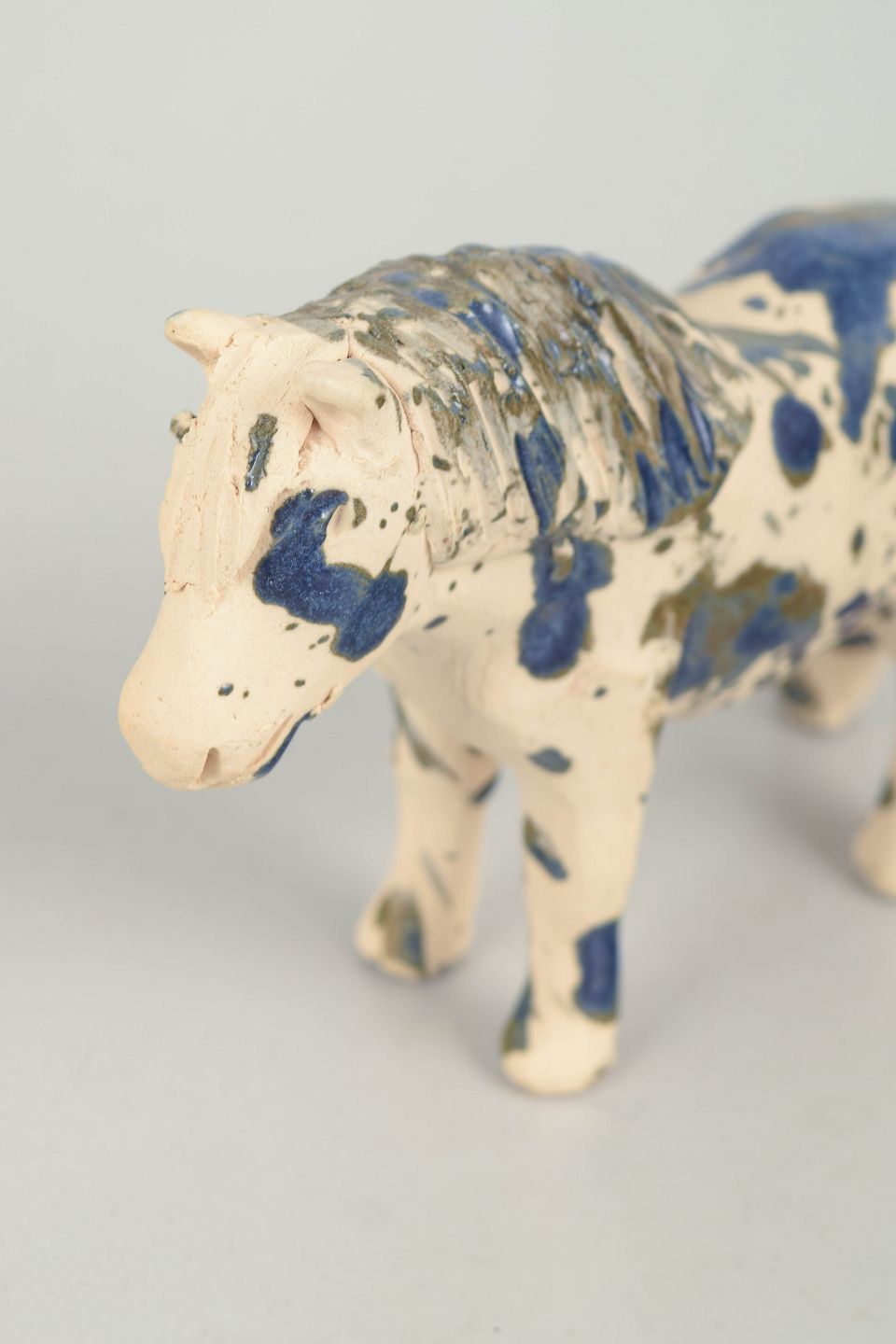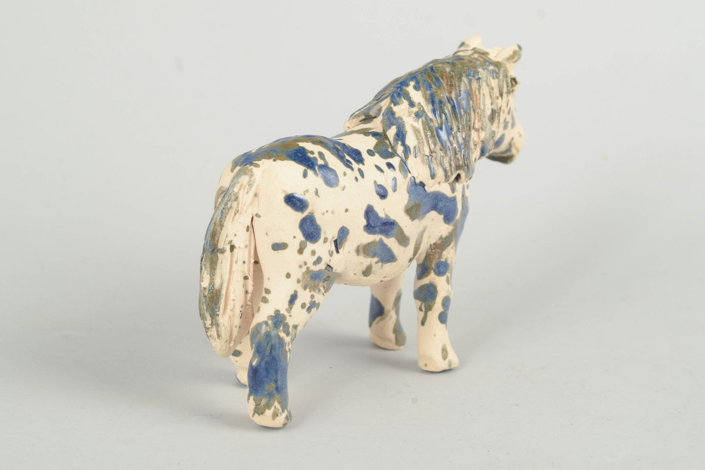 Unik keramisk figur forestillende en pony udført i stentøj med lys glasur dekoreret med blå og brunlige nuancer i et spontant, malerisk mønster. Figuren er modelleret med naturlig kropsholdning og detaljeret manke og hoved, hvilket giver et levende og karakterfuldt udtryk. Usigneret unika fra 1970’erne.