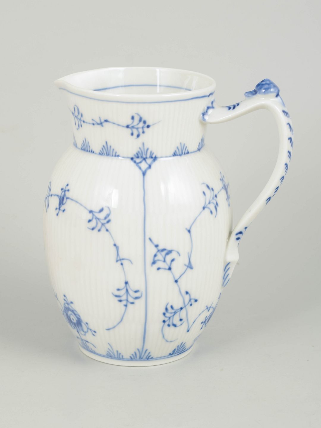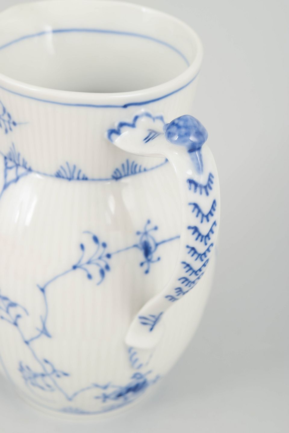 Håndmalet kande i porcelæn dekoreret med det klassiske musselmalede riflet mønster i blå underglasur. Formen har riflet korpus, svungen hank med reliefdekoration og bred tud. Undersiden er fabriksstemplet Royal Copenhagen. Annulleret med én indridset streg gennem fabriksstemplet. Model 1/450.