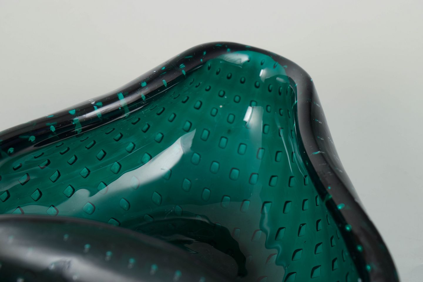 Organisk formet kunstglasskål i grønt glas med indkapslede luftbobler og blødt bølgende rand, udført i den karakteristiske Murano-stil fra midten af det 20. århundrede.