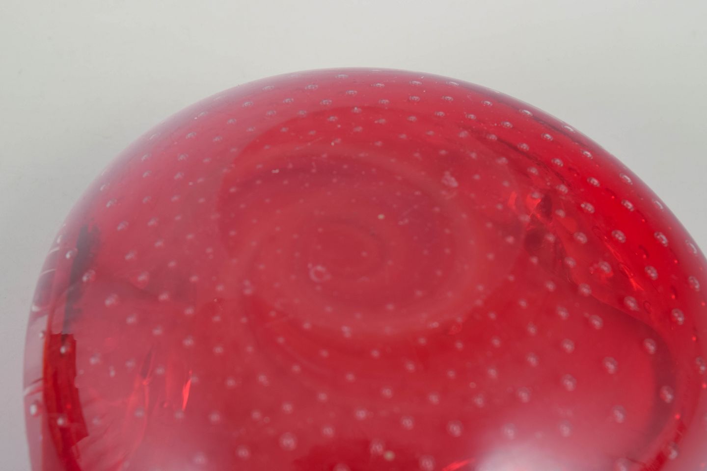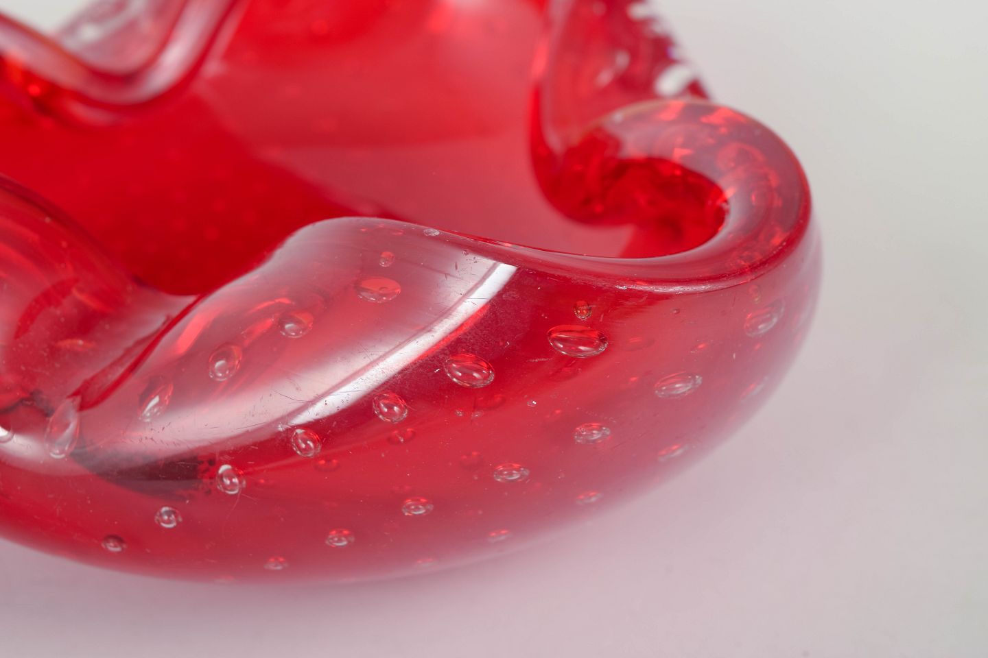 Organisk formet glasskål i kraftigt rødt glas med indkapslede luftbobler og blødt bølgende rand, udført i den karakteristiske italienske kunstglasstil fra Murano.