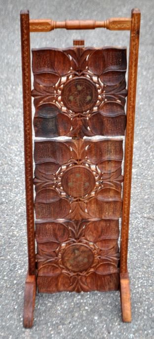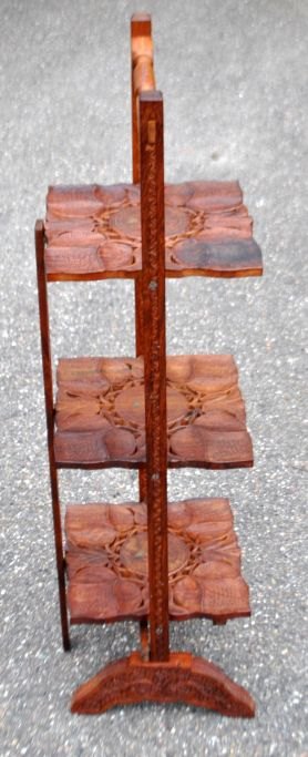 Cake stand i teak træ, 19. årh. Indien. Med tre etager med udskæringer af blomster og blade. Med messing intarsia i form af blomster. H: 80,5 cm. B: 27,5 cm. D: 24 cm.