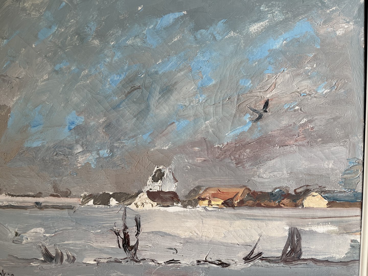 Maleri af William Hansen - Vinterpart fra Vejlby Kirke ved Strib 1972.