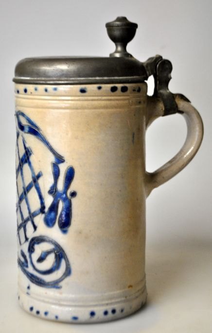 Tysk westenwälder krus, 1853, stentøj, med grå saltglasur. Med manganviolet dekorationer. Med låg og gæk i tin. Indgraveret: F.W.H. 1853. H: 23 cm.