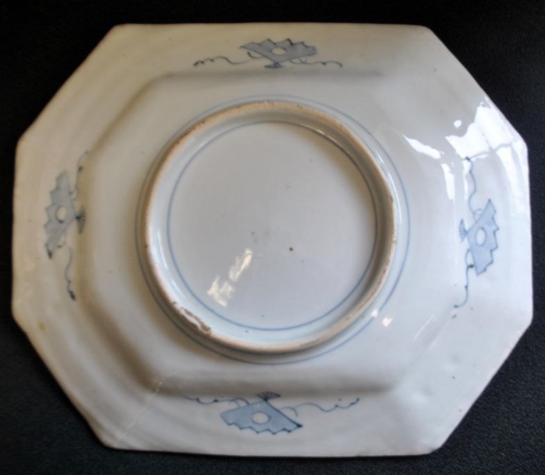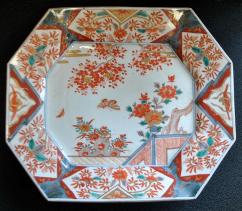 8 kantet Imari fad, 19. årh. Japan. Polykrom dekoreret med forgyldninger. Håndmalet dekoration i frim af tæer, buske og sommerfugle. L. 30 cm. B.: 25,5 cm.