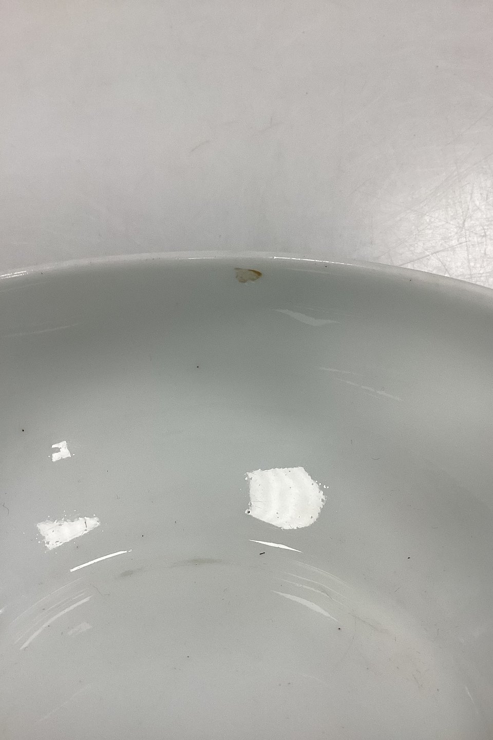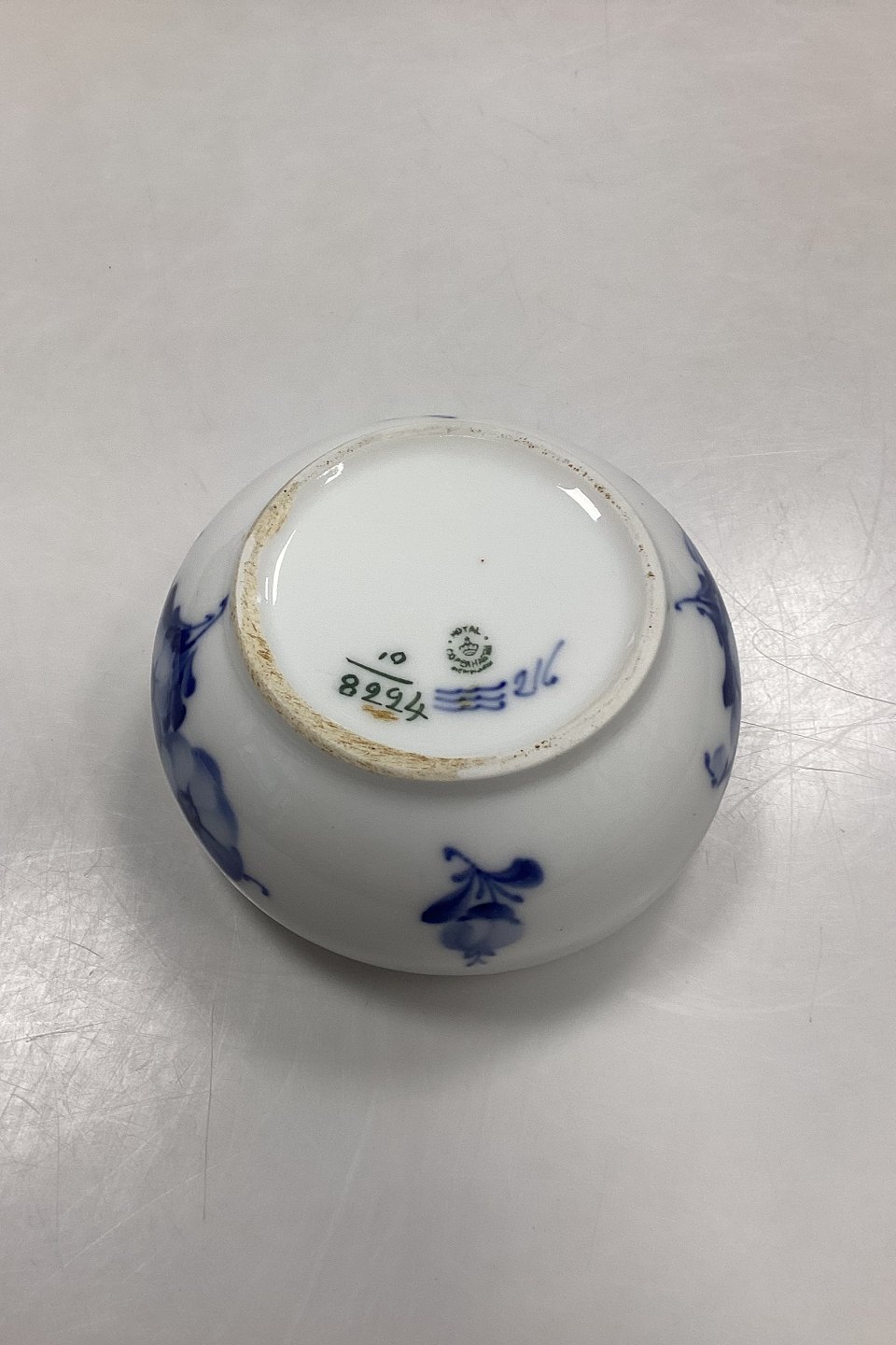 Royal Copenhagen Blå Blomst Flettet Skylleskål No. 8224. Måler 13 cm x 13,5 cm / 5,12 in. x 5,31 in. pga skævhed i kanten. 2. Sortering med små sorte brændingsnister og lille glasurfejl indvendig øverst under kanten, se foto.