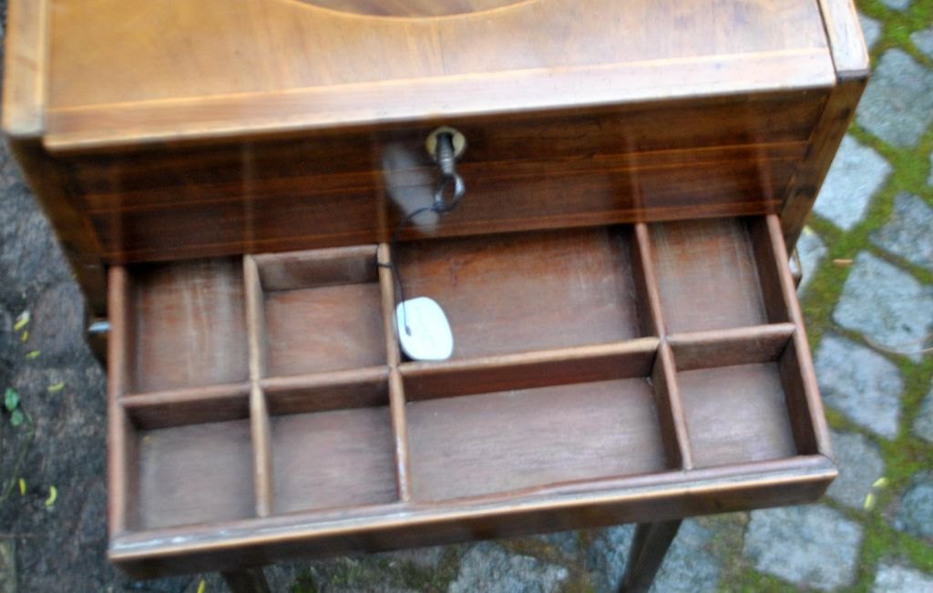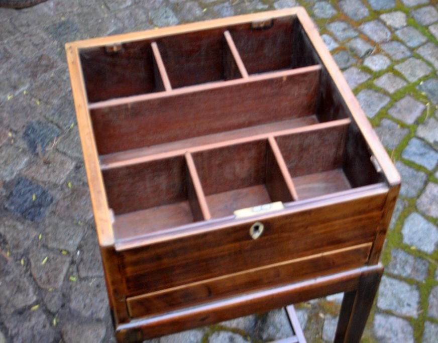 Empire sybord, 19. årh. Danmark. Med intarsia. Med oplukkelig og aflåselig plade, hvorunder der er mindre rum. Yderligere en skuffe med rum. På tilspidsede ben. H.: 75 cm. B.: 30 cm. D.: 30 cm.
