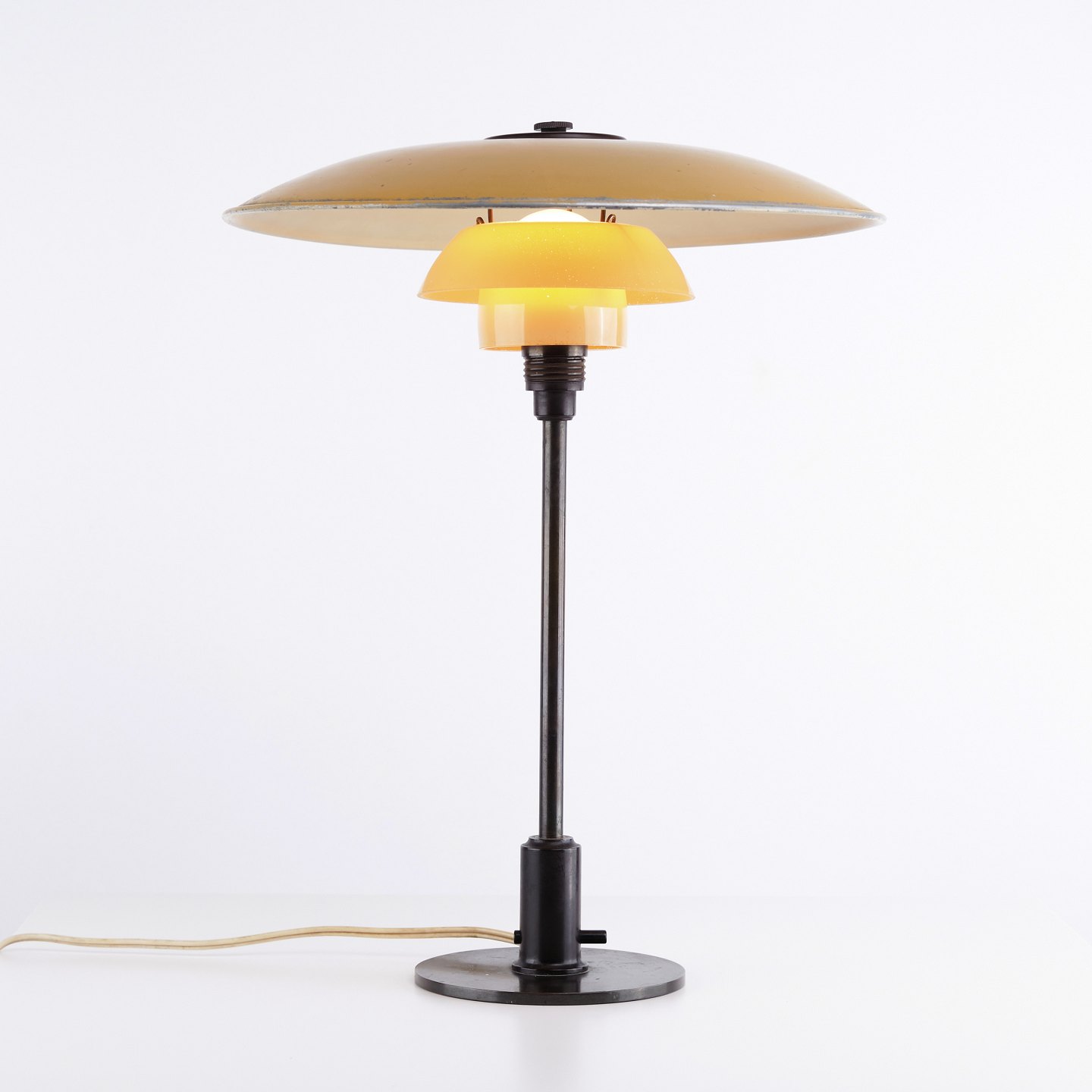 Rare PH 3.5/2.5 table lamp designed by Poul Henningsen and produced by Louis Poulsen in the 1930s. The lamp has a yellow painted metal top shade with a frame in burnished brass, as well as middle and bottom shades in single-layer yellow painted opal glass.