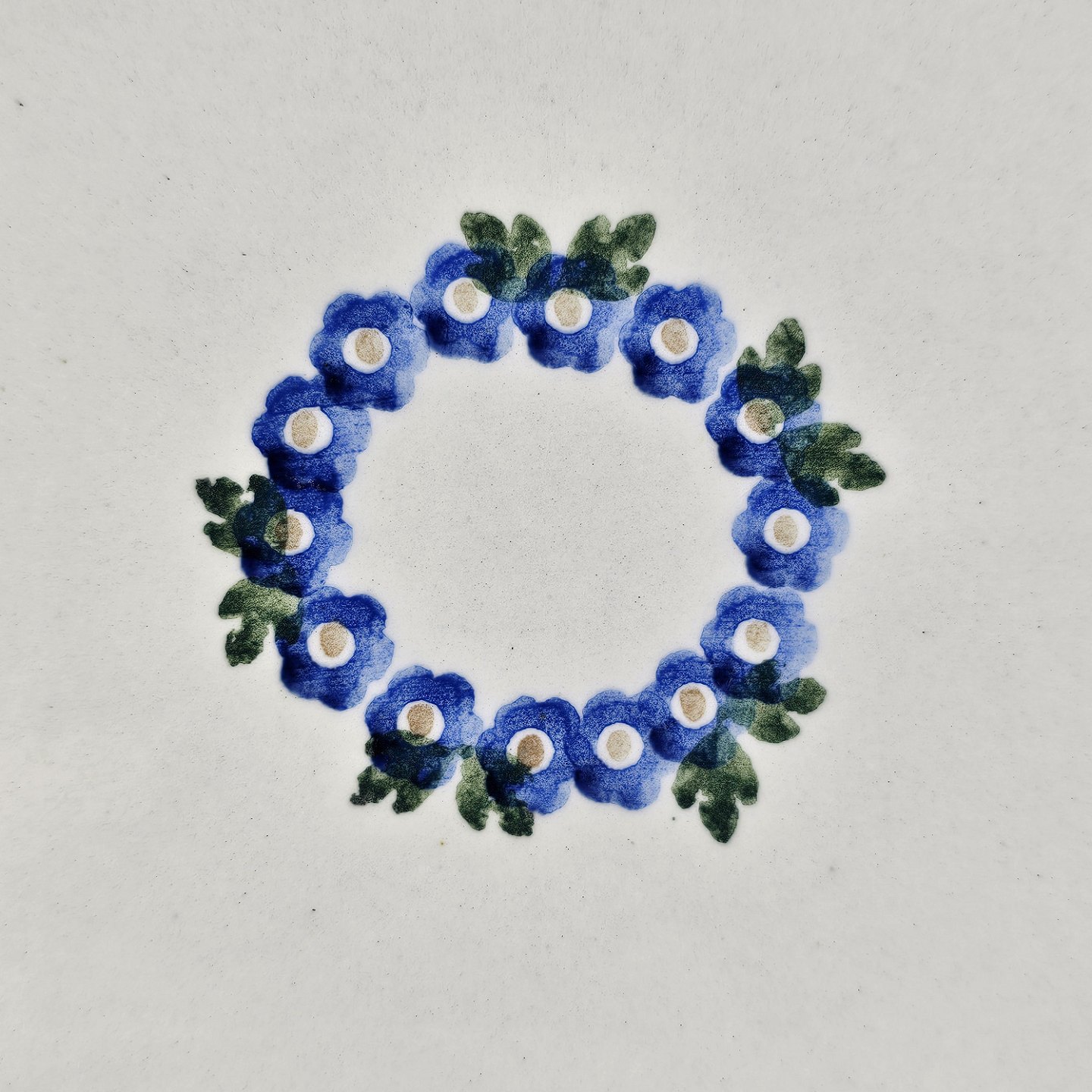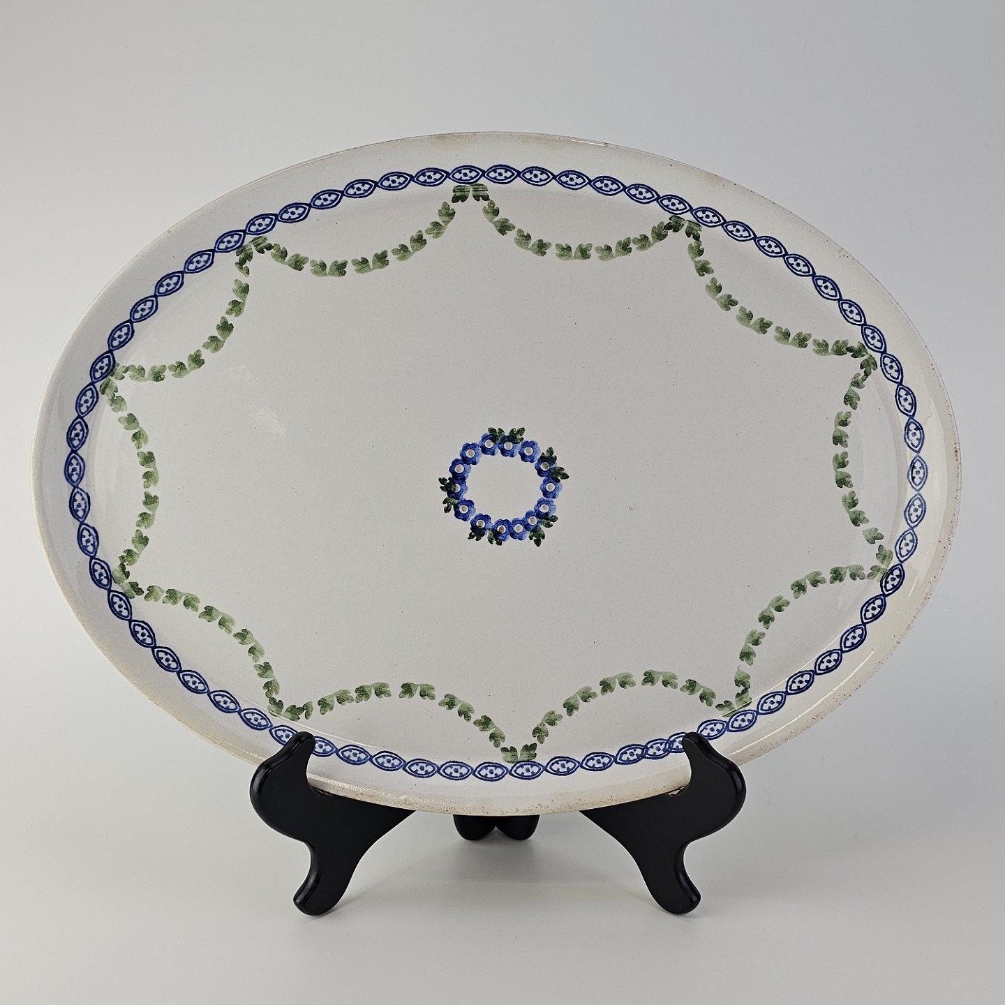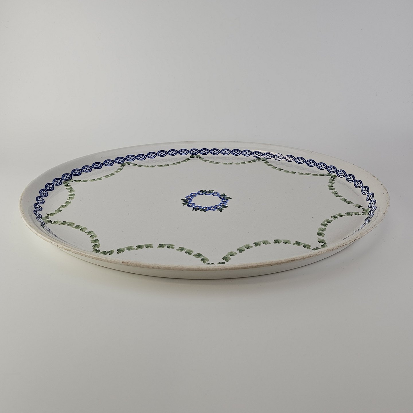 Ovalt fad fra stellet Kærminde i hvid fajance med blå dekoration