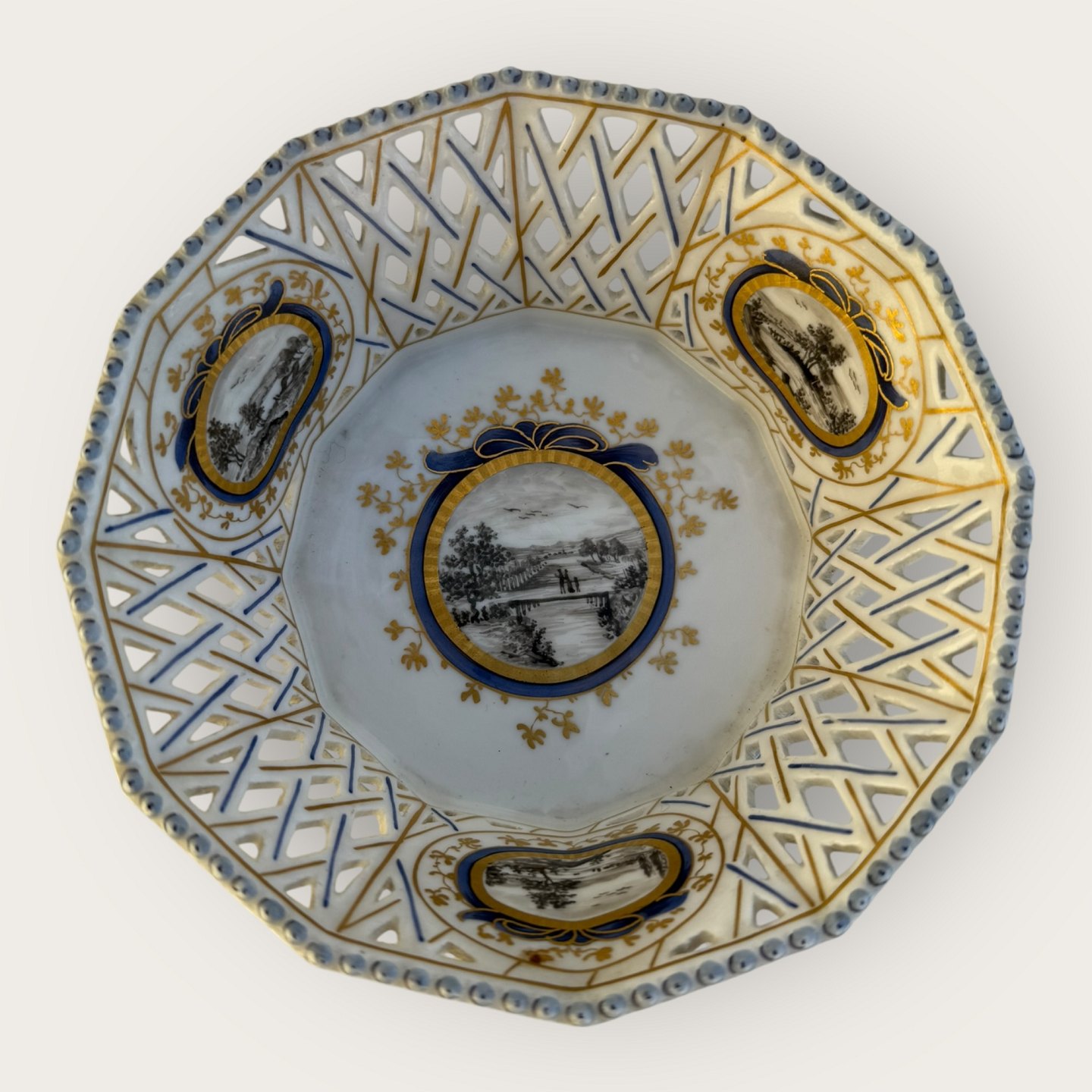 Nymphenburg porcelæn, to retikulerede skåle (gennembrudt gittermønster i kanten), med håndmalede landskabsmotiver, den ene skål med revne i bunden ( se foto) ellers fin stand, Hver skål måler ca. 5x14cm.