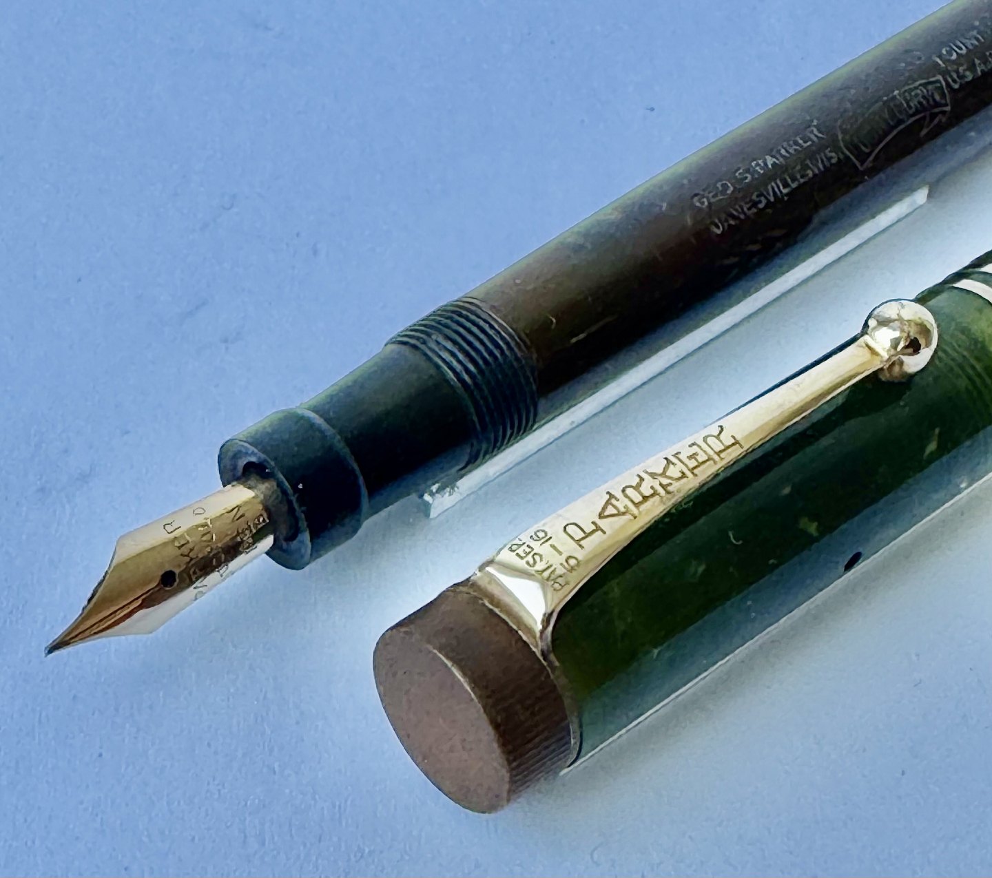 Kort grøn marmoreret Lady Parker Duofold Lucky Curve fyldepen fra omkring 1930. Har et stort skår på hættens åbning, kant. Ellers ingen skader eller reparationer. Push button blæk-påfylder. Der skal indsættes en ny gummisæk før end fyldepennen igen kan optage blæk og skrive. 11,5 cm lang.