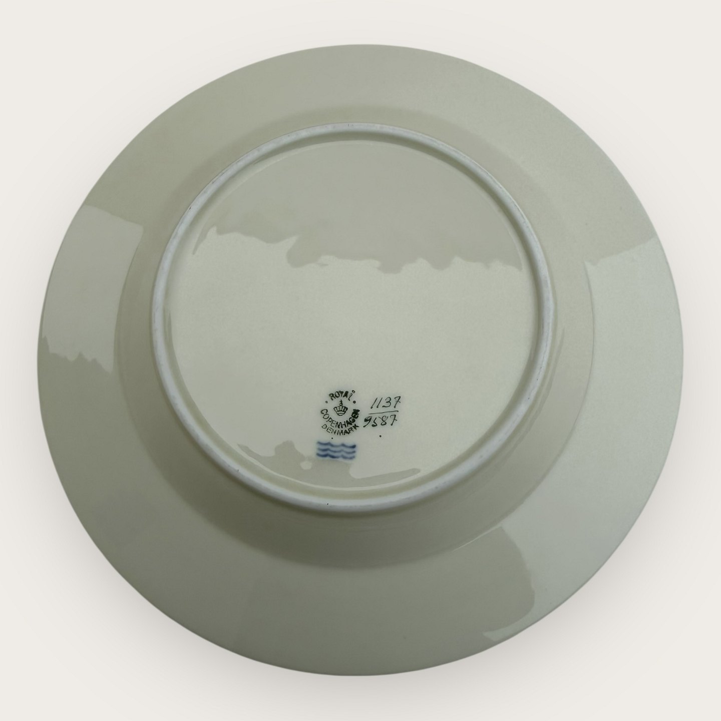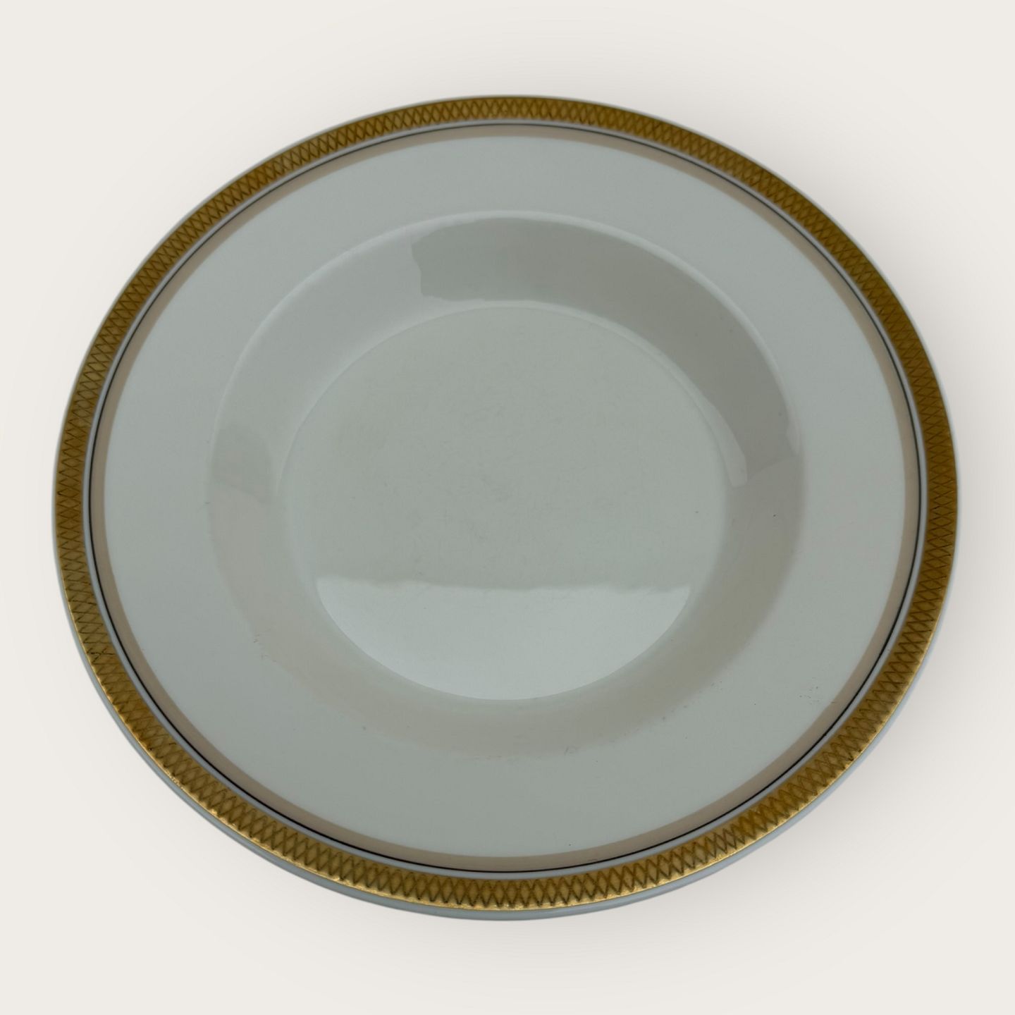 Royal Copenhagen, Liselund uden dekoration, # 1137/9587 (også kendt som 1173) , stor dyb tallerken, 24,5cm i diameter, 1. sortering *fremstår med lidt misfarvning på guldkanterne ellers pæn stand*