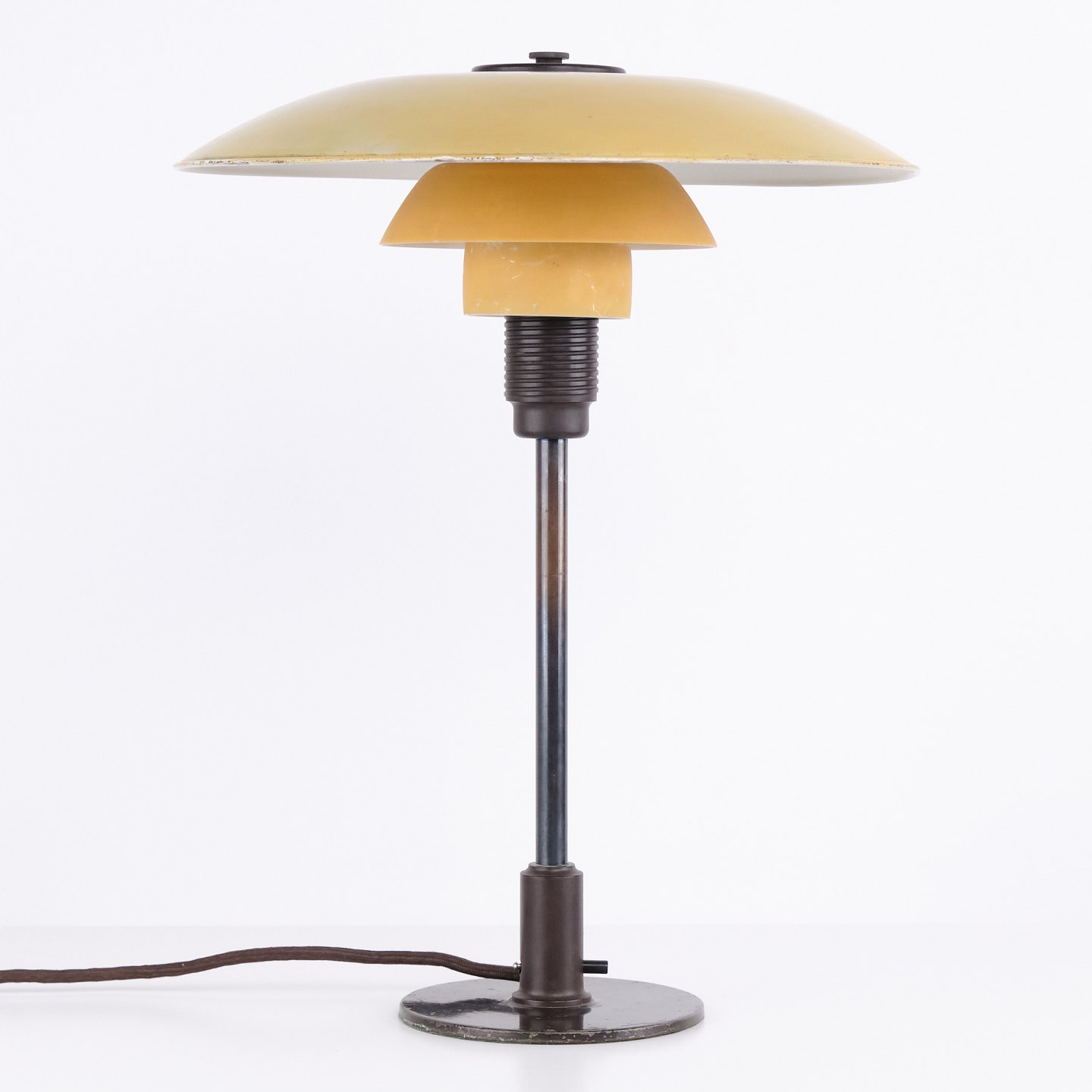 PH 3½/2½ table lamp designed by Poul Henningsen and manufactured by Louis Poulsen in the 1930s. The lamp features a yellow metal top shade with middle and lower shades in yellow-painted opal glass, creating a warm and distinctive light. The combination of materials and colours highlights the lamp’s functional and decorative character.
