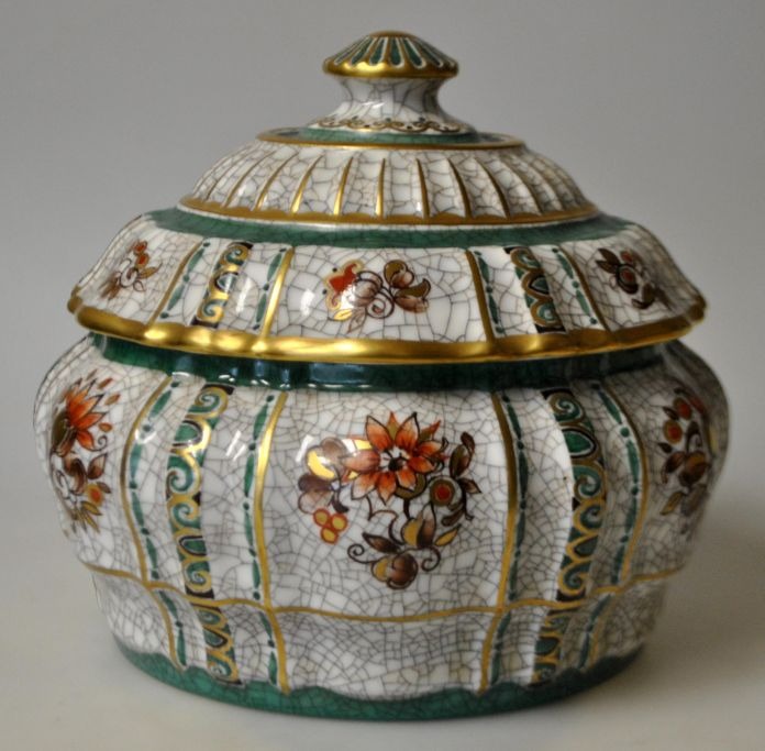 Dahl Jensen lågkrukke i craquelle, 241/704, 20. årh. København, Danmark. Håndmalede blomstermotiver, grønt og forgyldninger. H: 16 cm. Dia: 19 cm.