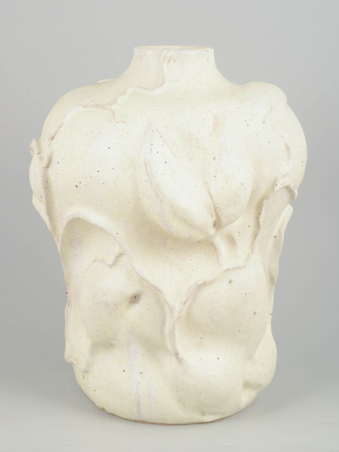 Meget stor unika stentøjsvase, organisk formet med blomstermotiv og dækket af beige, mat glasur.