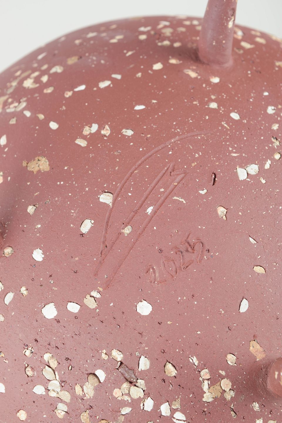 Unika Skål i rødt stentøjsler på tre spidse ben. Uglaseret på ydersiden fremstår den med det røde, varme ler som en kompliment til den mørke celadonglasur på indersiden af skålen.