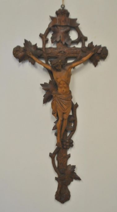 Udskåret træ krusifix, 19. årh. Tyskland. Kors dekoreret med vinranke, vindruer og løb. H: 48 cm. B.: 22 cm.