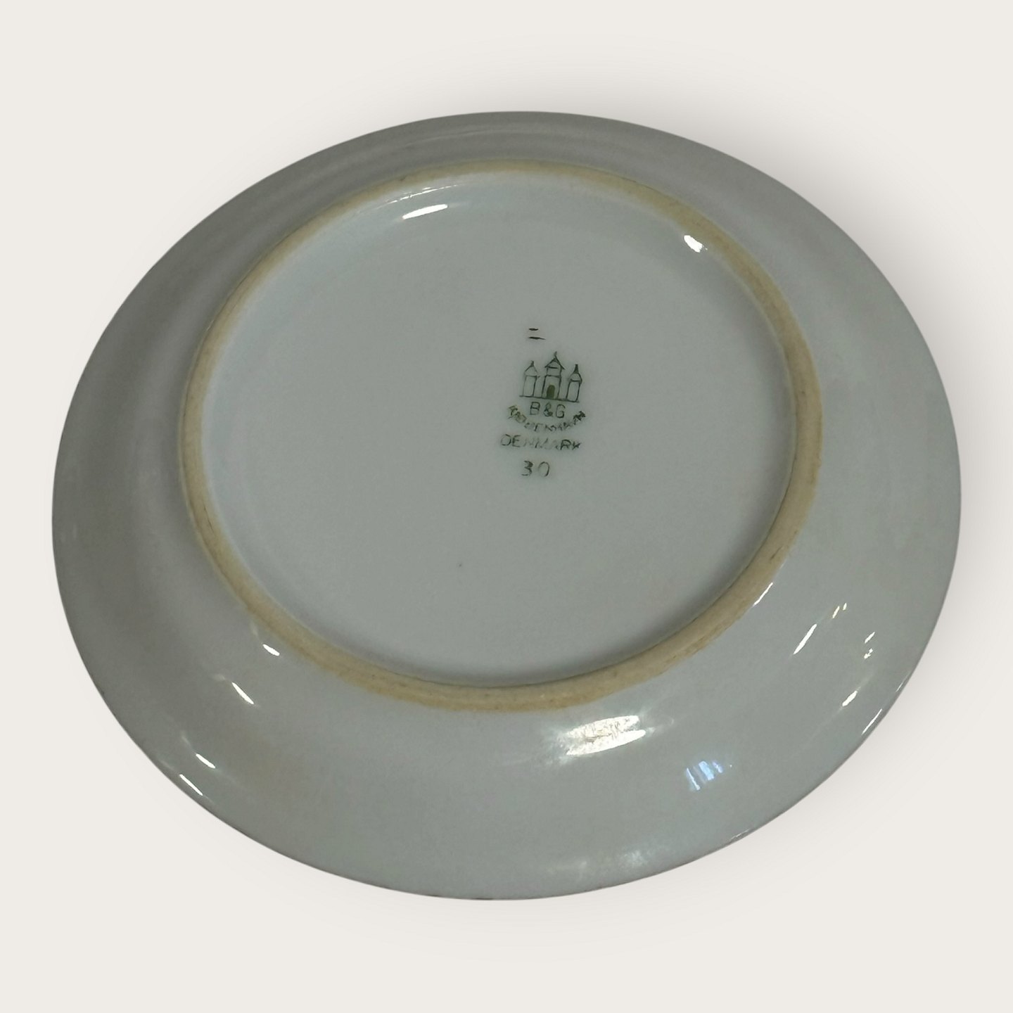 | Bing & Grøndahl, Aakjær, Hvid porcelæn med guldkant, lille asiet # 30, 9,5cm i diameter, 1.sortering *Pæn stand*