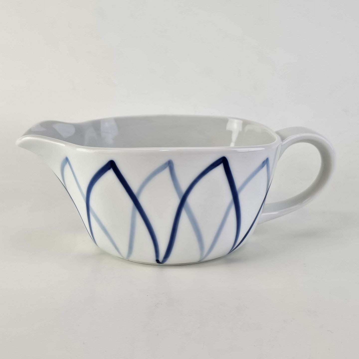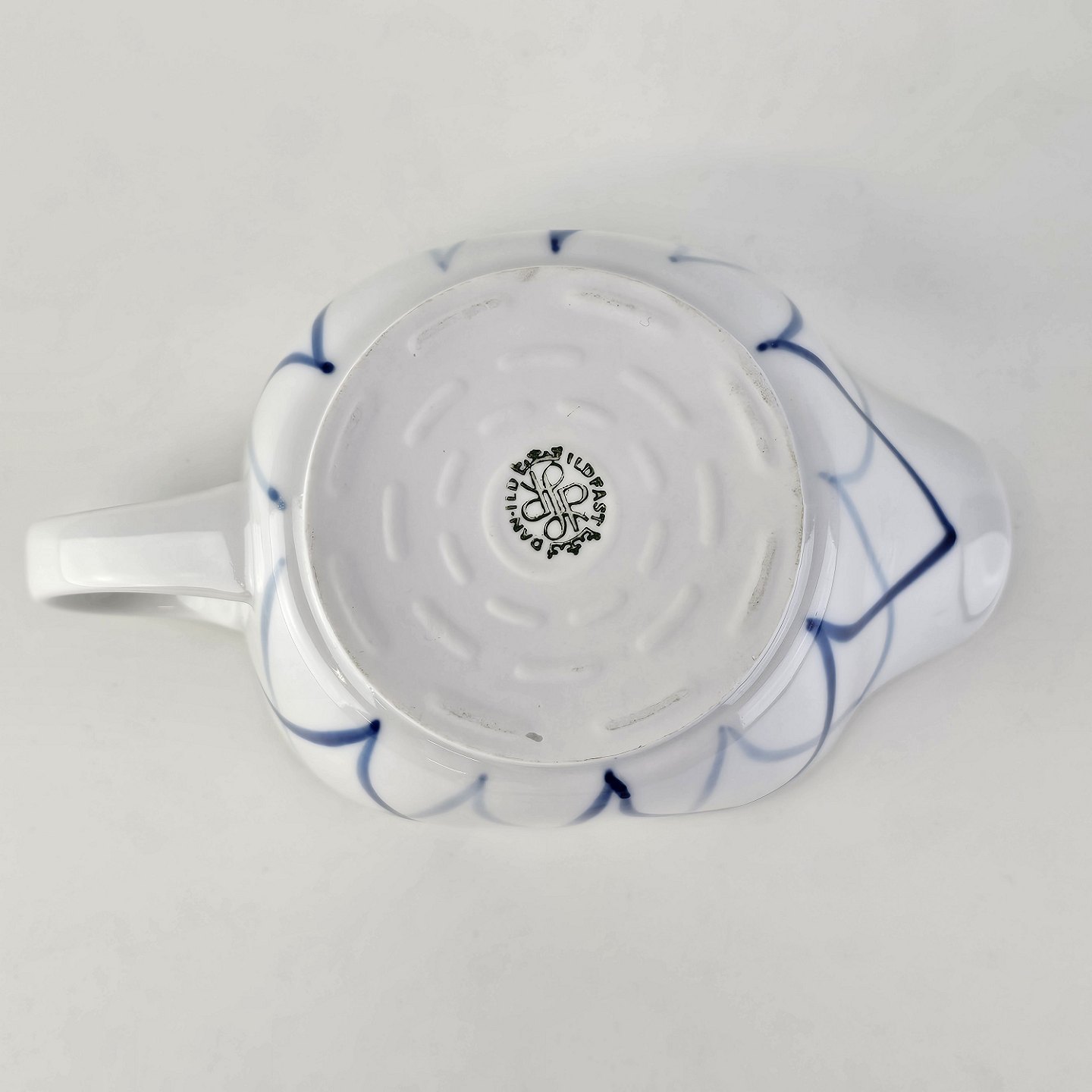 Blå Flamme er hvidt ildfast porcelæn dekoreret med blå striber, der ligner flammer.