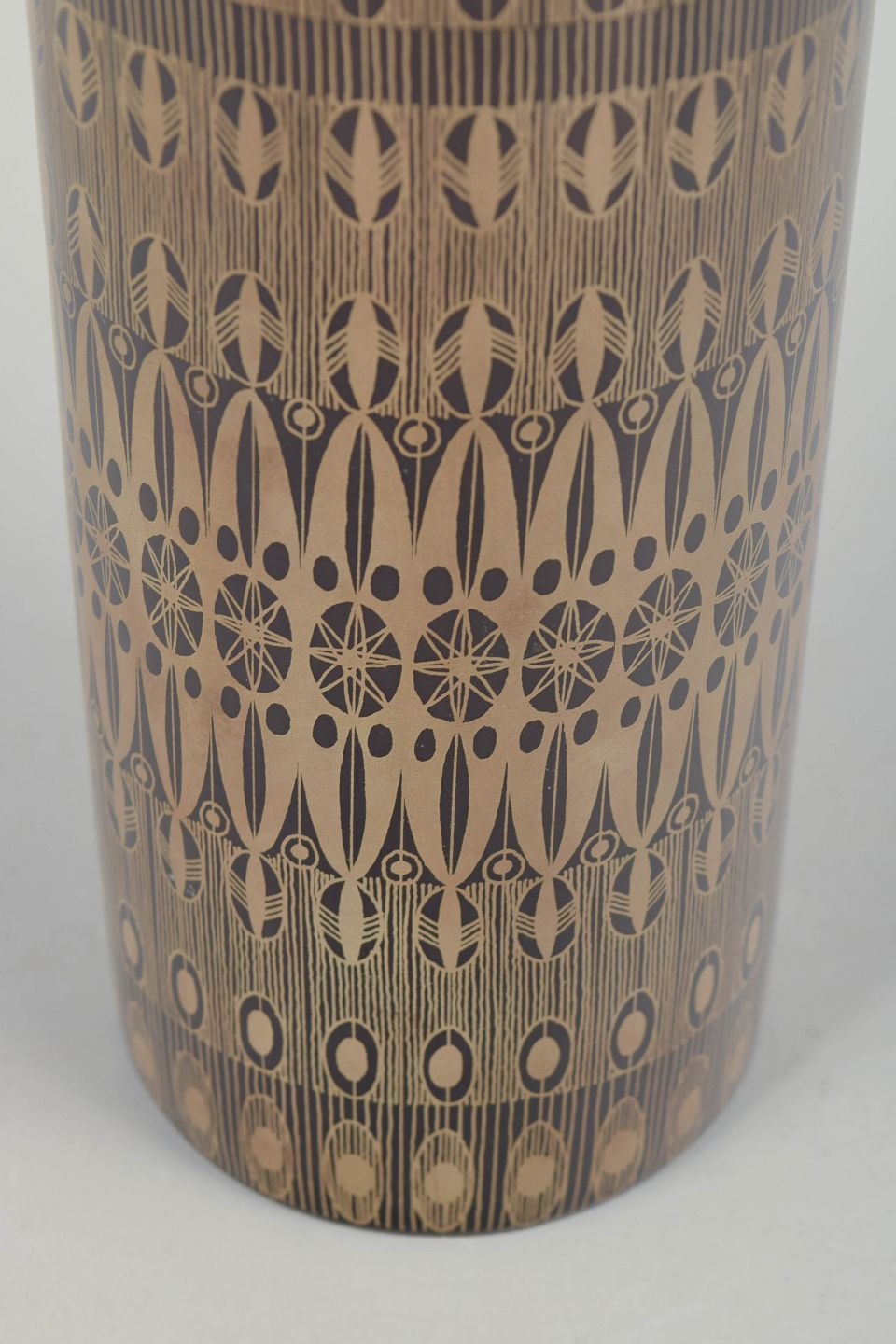 Slank porcelænsvase med høj hals og rig gulddekoration i geometrisk mønster på mørk baggrund, typisk for Rosenthals dekorative produktion i slutningen af det 20. århundrede.