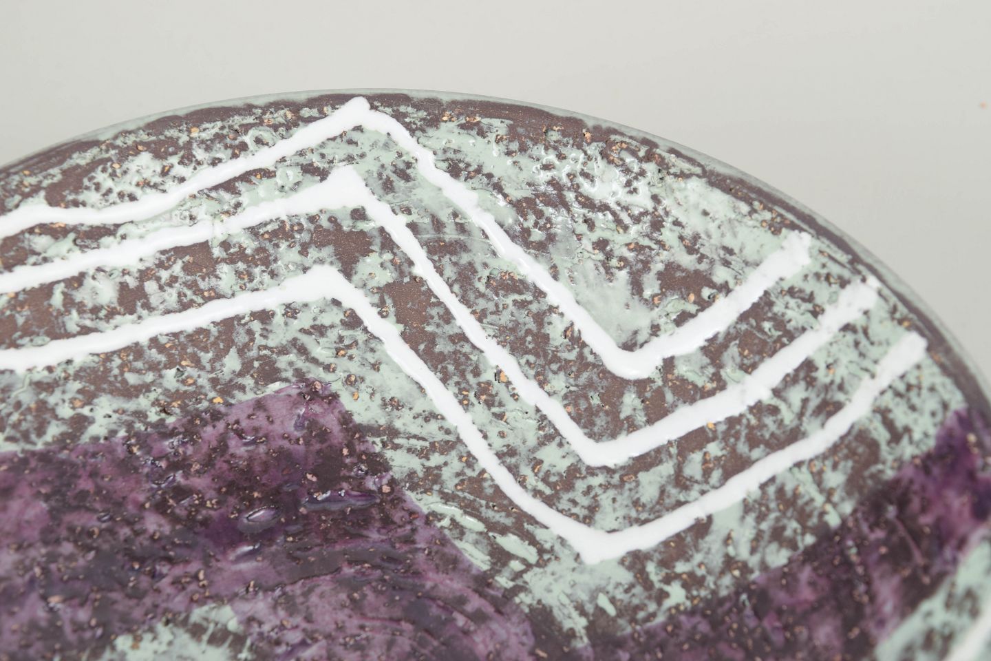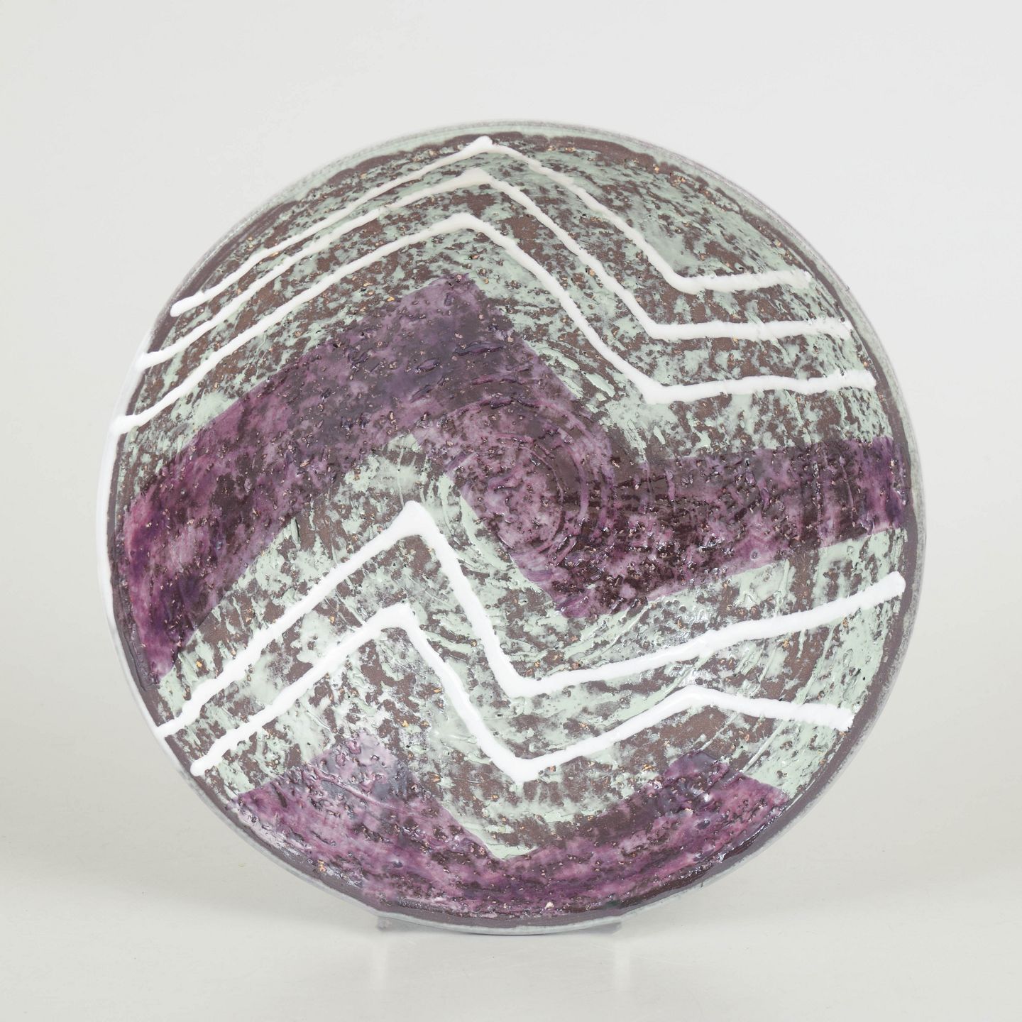 Skål i stentøj model 2361 fra Progresso-serien med dekorativ glasur i lilla og lyse nuancer samt karakteristisk geometrisk mønster i hvid.