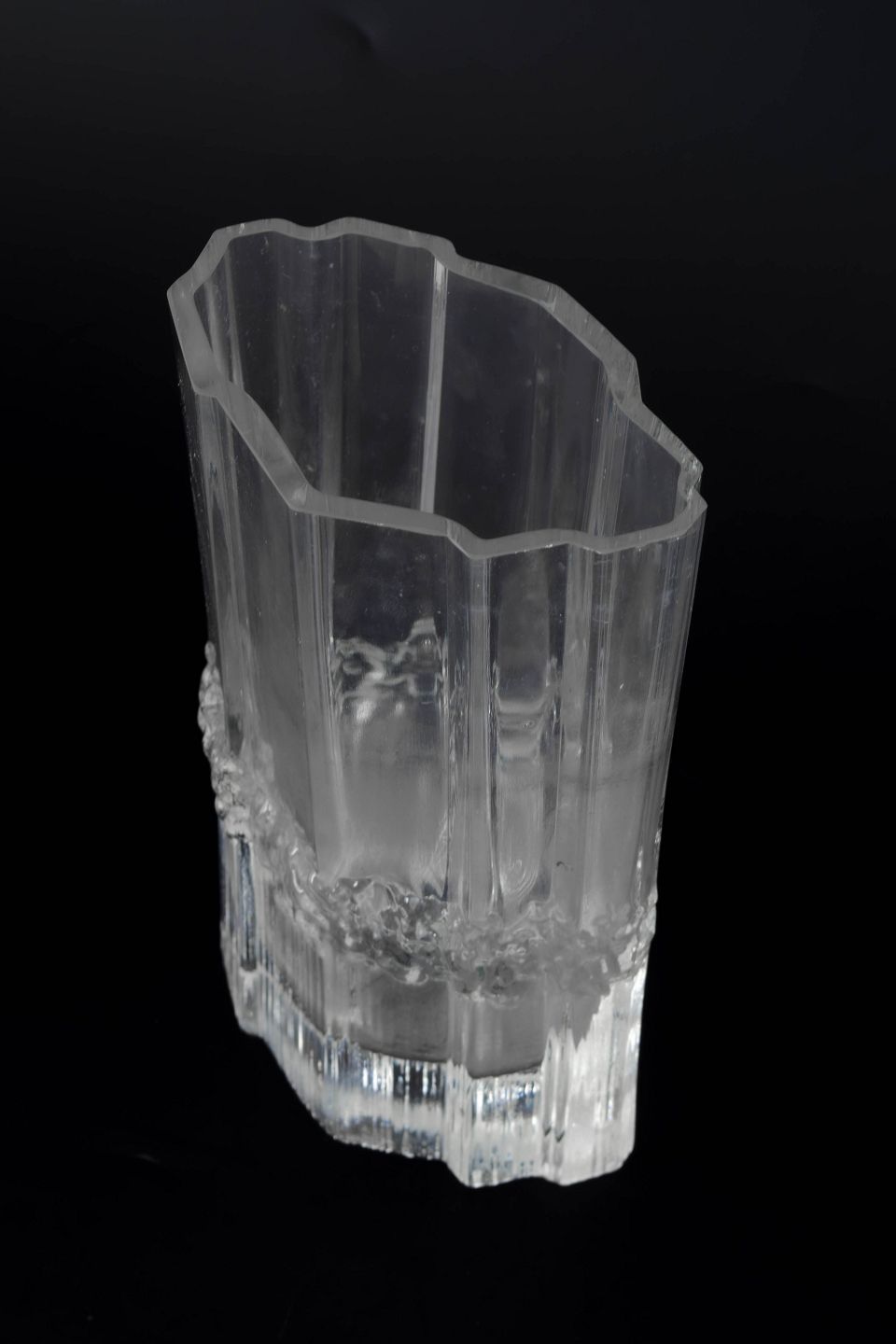 Klar glasvase med karakteristisk is-struktureret bælte omkring midten og lodrette slebne flader. Organisk form med let bølget kant.